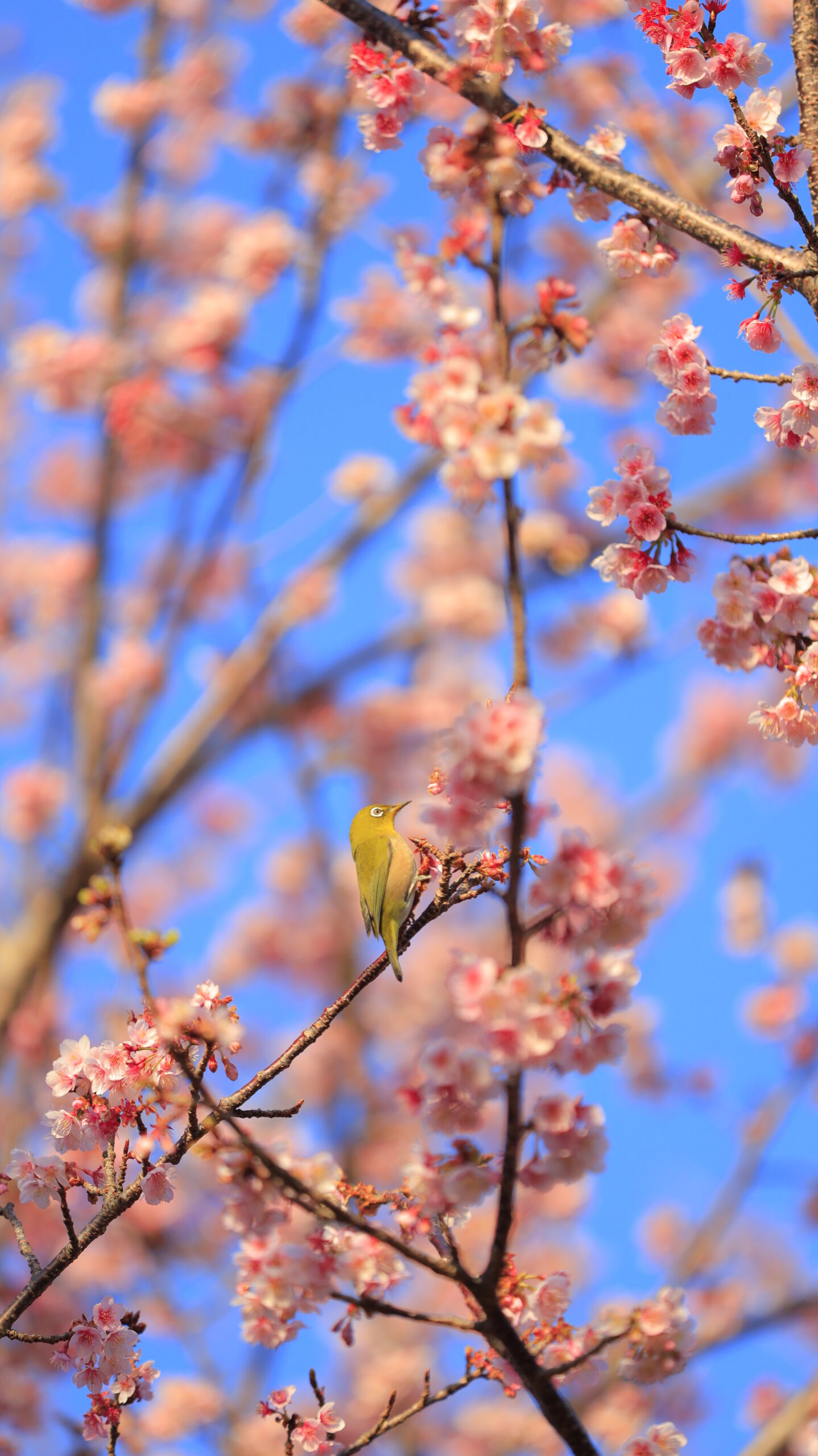 この写真は、抱湖園(南房総)で、桜の花をついばむメジロの自然な仕草を撮影したものです。