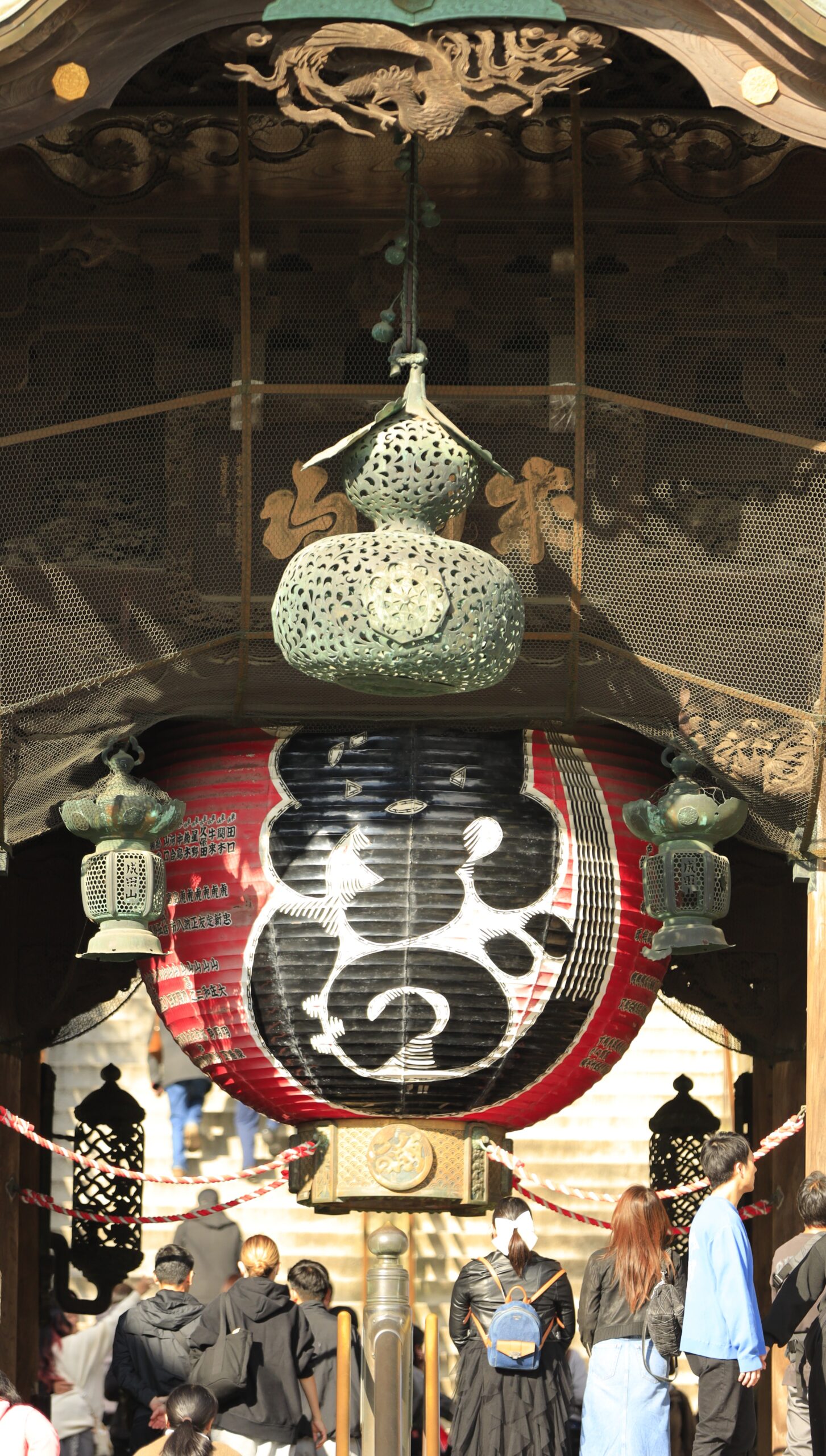 この写真は、成田山新勝寺の入口にある立派な提灯に注目して撮影したものです。大きな提灯の迫力と、歴史ある寺院の雰囲気が合わさり、参拝の玄関口としての存在感が際立つ一枚です。