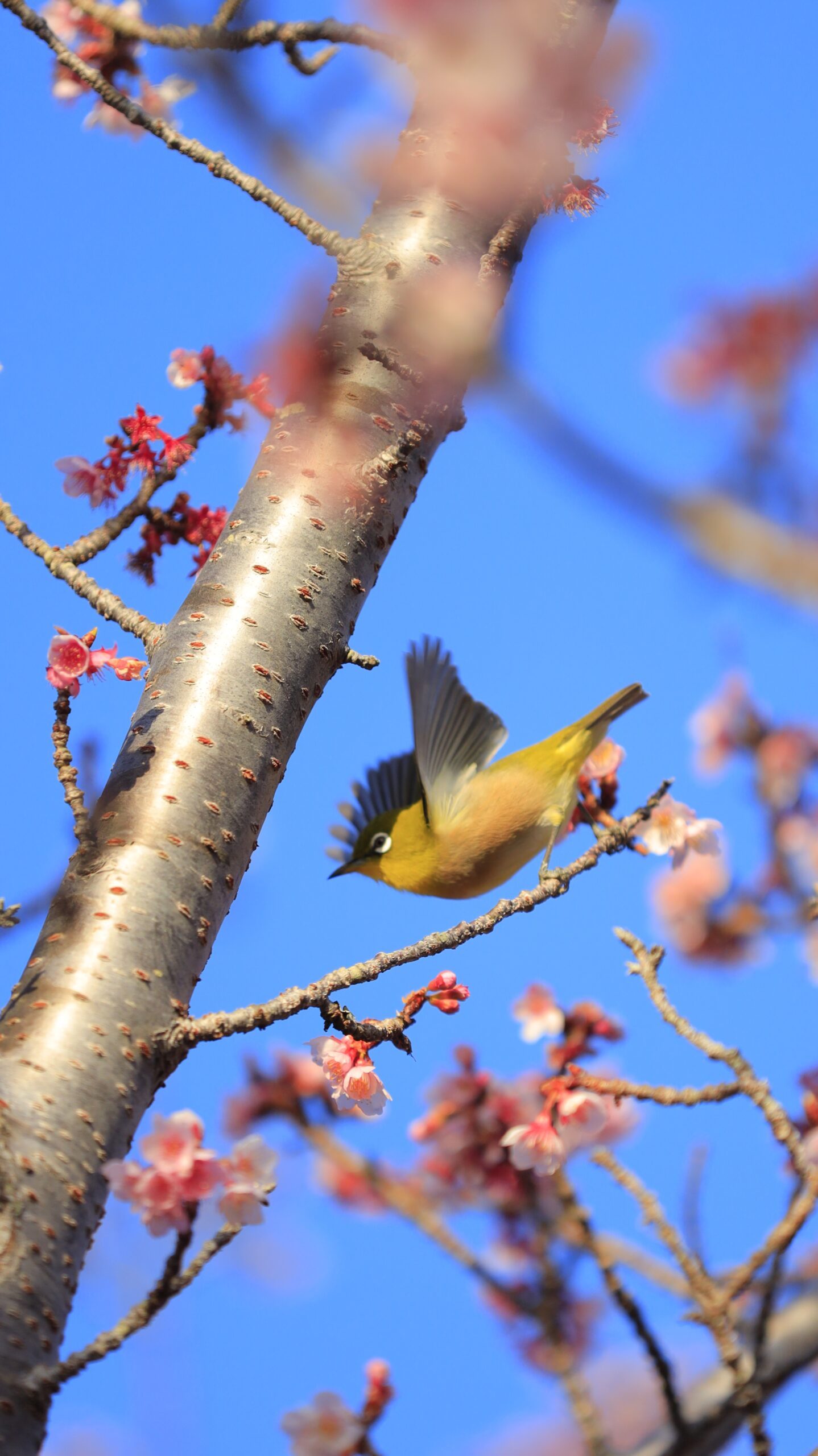この写真は、抱湖園(南房総)で、桜の木の間を飛び交うメジロの軽快な姿を撮影したものです。