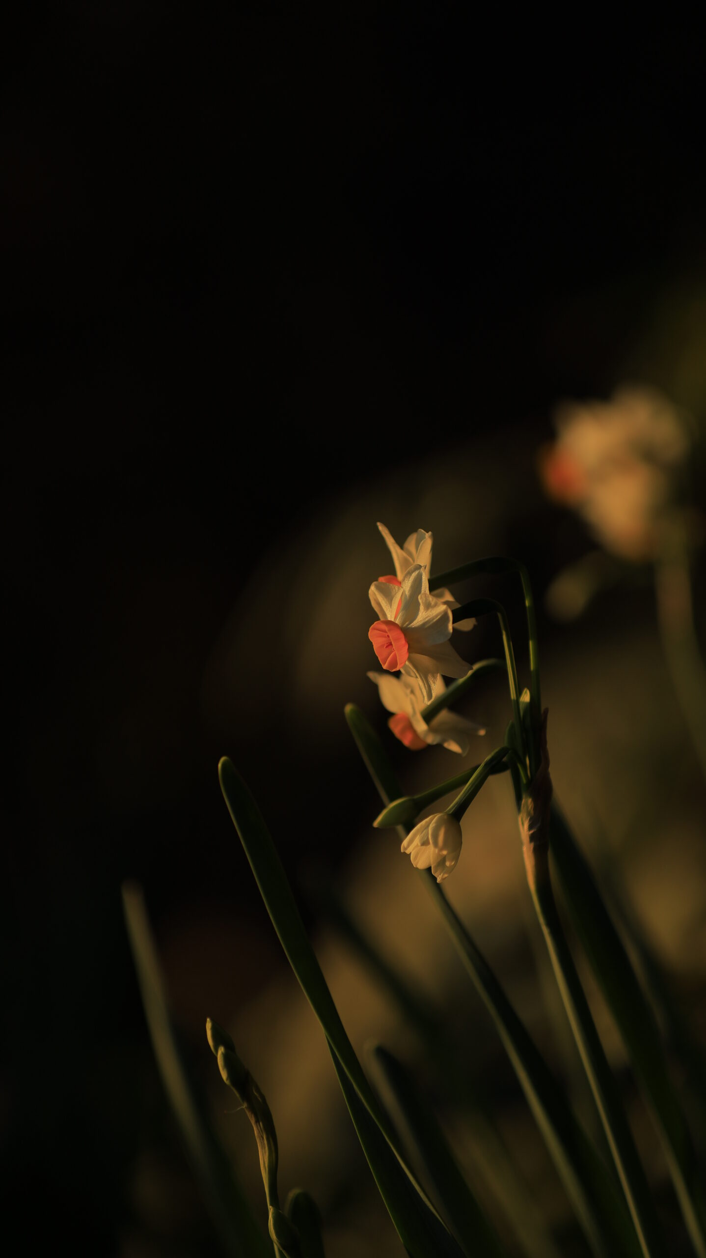 この写真は、真鶴岬(三ツ石海岸)で、海岸から少し上がった場所に咲いていた水仙の花に、朝日が当たる様子を撮影したものです。