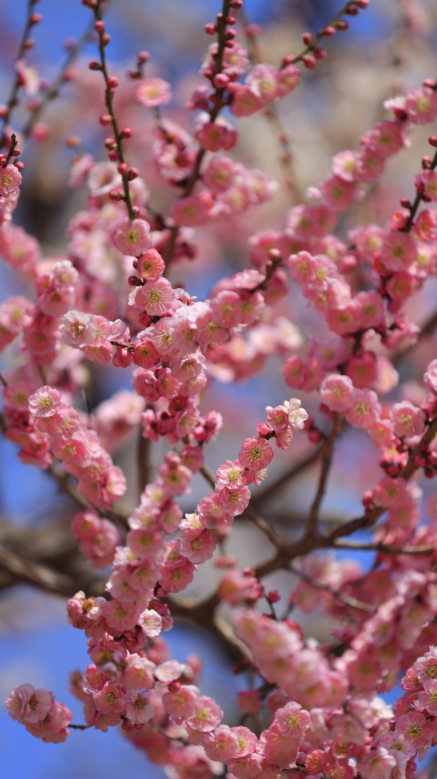 この写真は、偕楽園で、可愛らしいピンク色の梅の花を撮影したものです。小さな花びらが集まる姿がとても愛らしく、春の訪れを感じさせる一枚になっています。