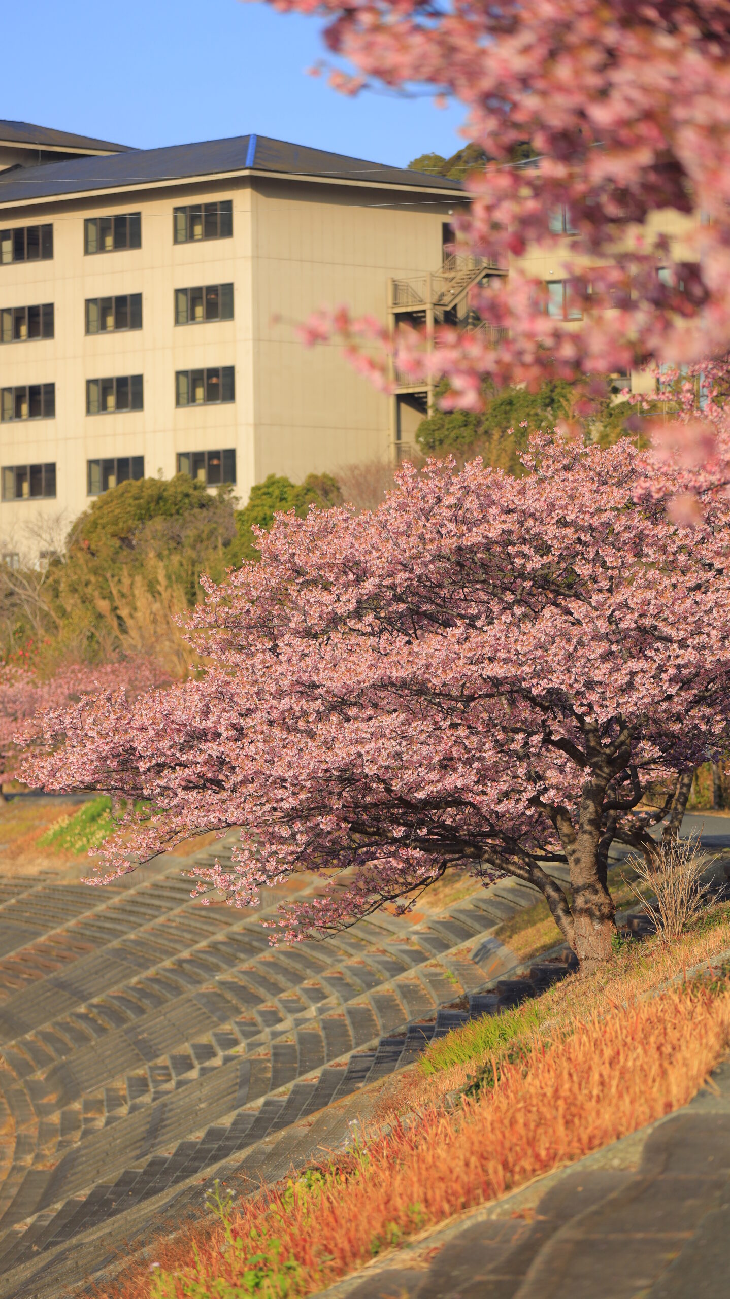 この写真は、みなみの桜と菜の花まつり(南伊豆町)で、土手沿いに咲き誇る河津桜と建物の風景を組み合わせ、地域らしい春景色を表現しました。