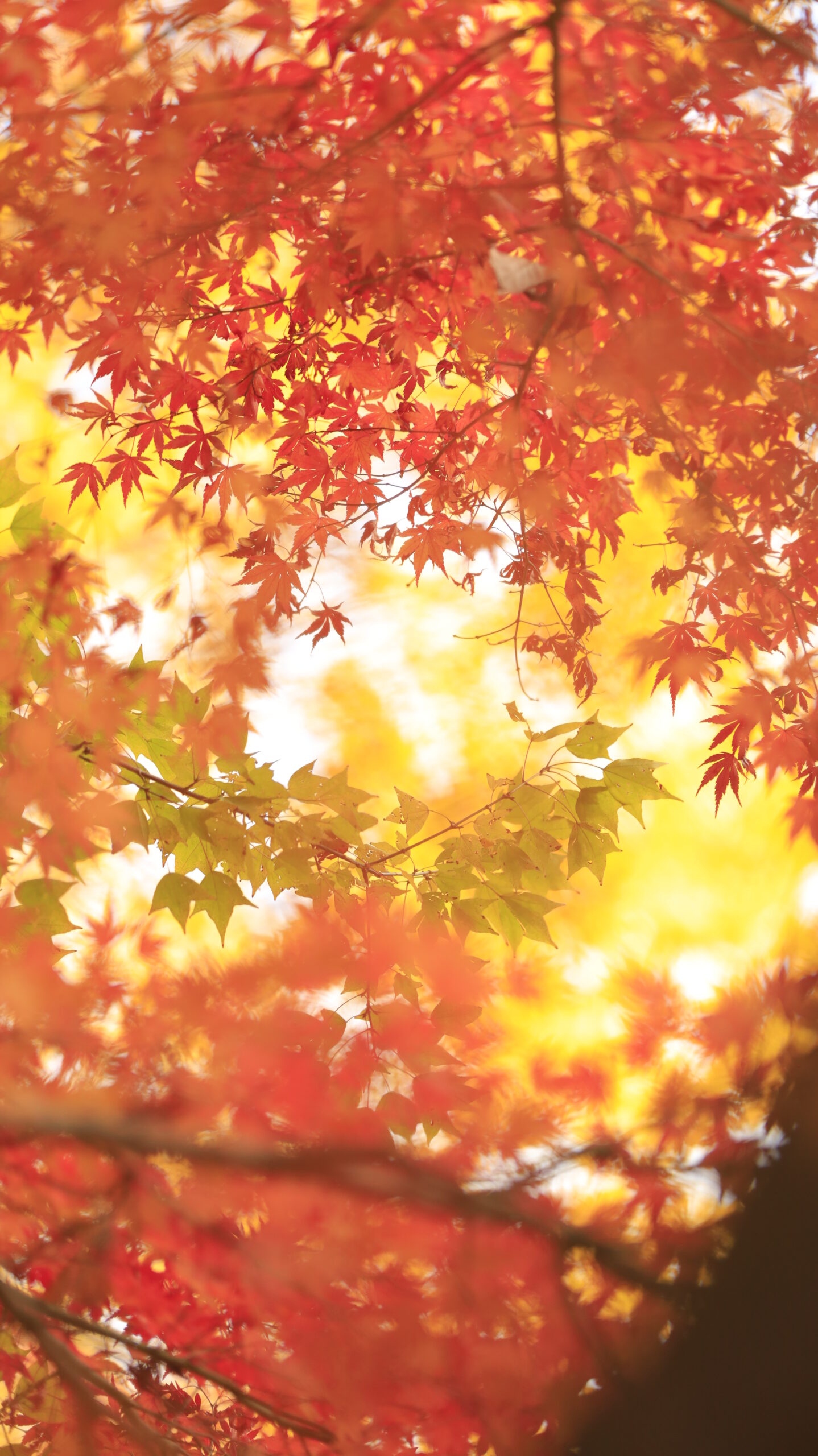この写真は、成田山公園で、銀杏の黄色を背景に、赤いモミジを見上げる形で撮影したものです。赤・黄・緑の三色が同時に楽しめる、色彩豊かな秋のワンシーンです。