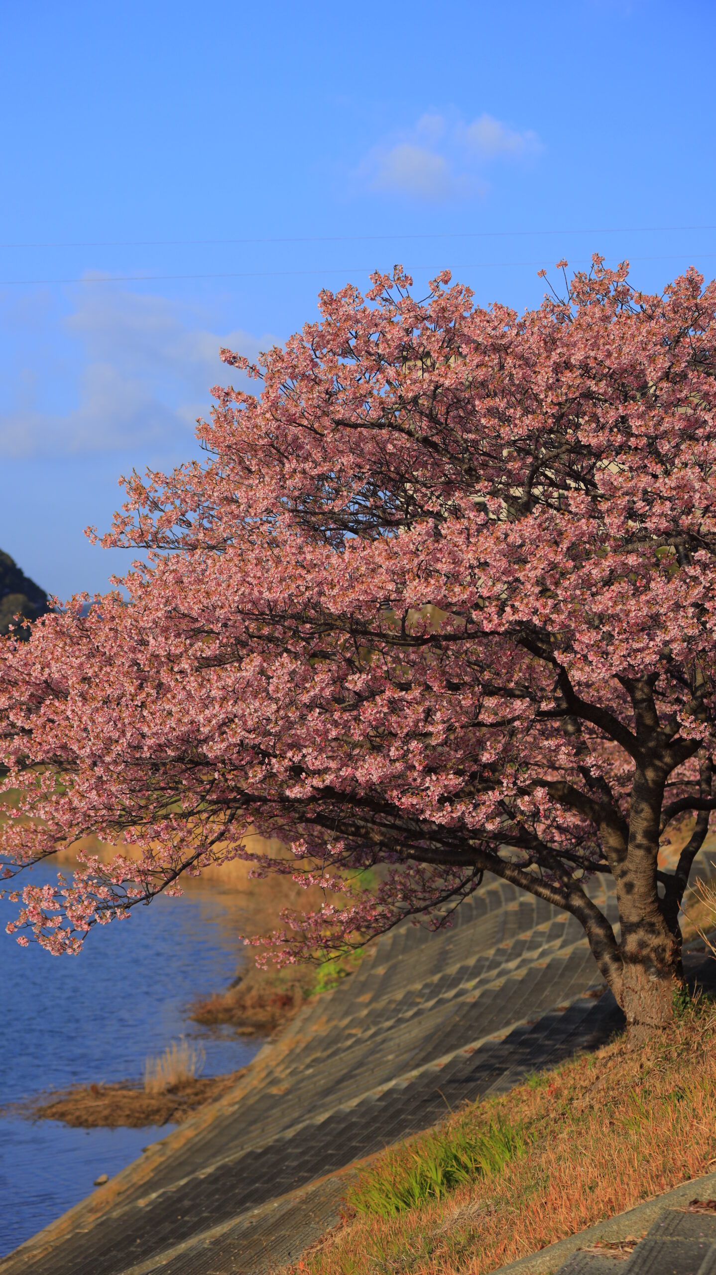 この写真は、みなみの桜と菜の花まつり(南伊豆町)で、満開の河津桜と抜群の晴天を撮影し、伊豆の春の爽やかさを強調しています。