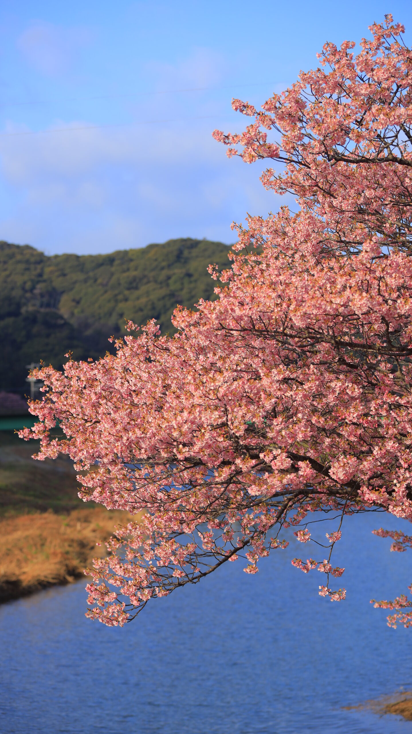 この写真は、みなみの桜と菜の花まつり(南伊豆町)で、順光に映える河津桜と青野川、青空を撮影し、色彩の鮮やかさを引き出しました。