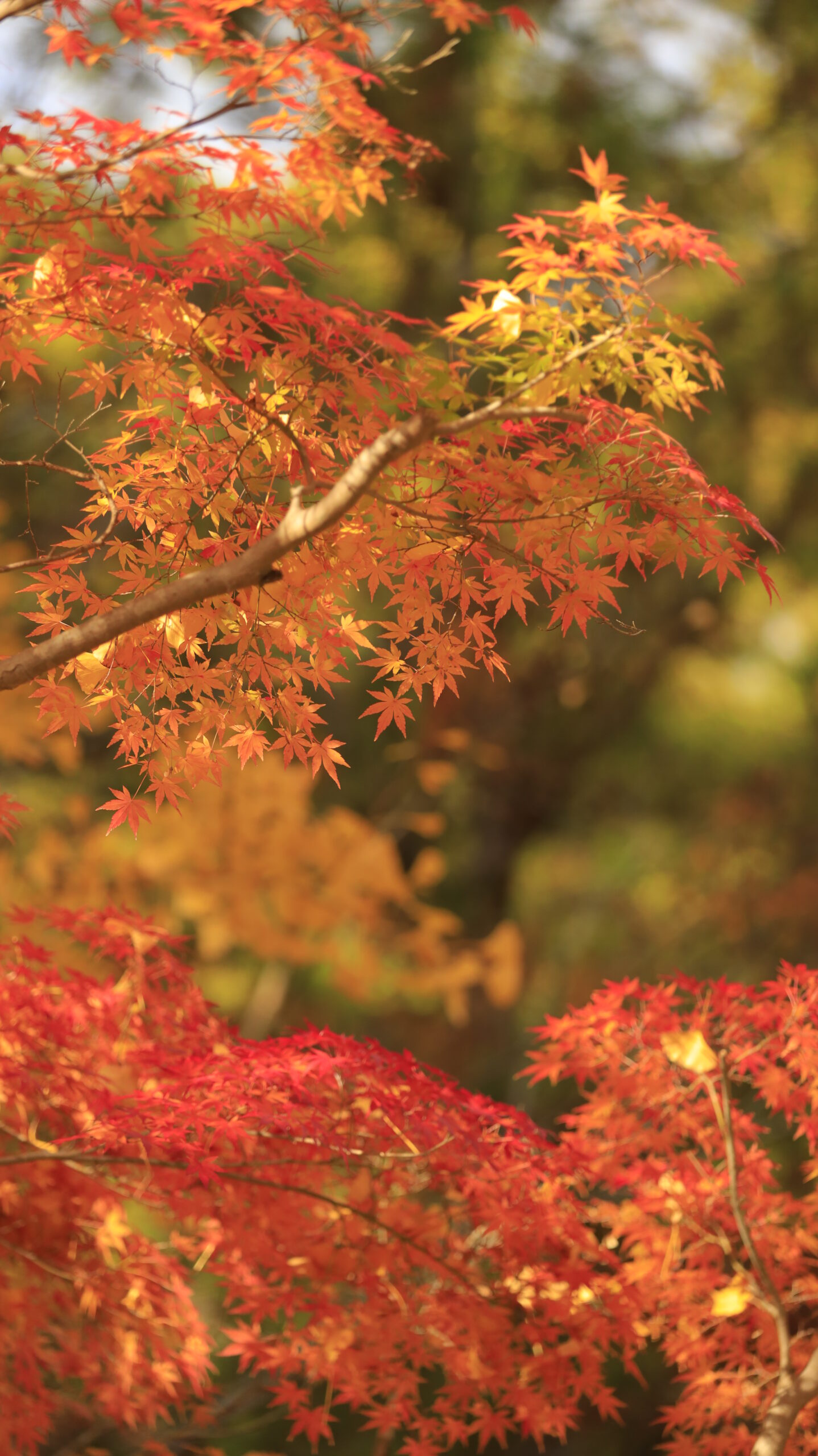 この写真は、成田山公園で、赤とオレンジのモミジが光に照らされる様子を撮影したものです。日差しを受けて輝く葉の質感が美しく、秋らしい華やかさが際立っています。