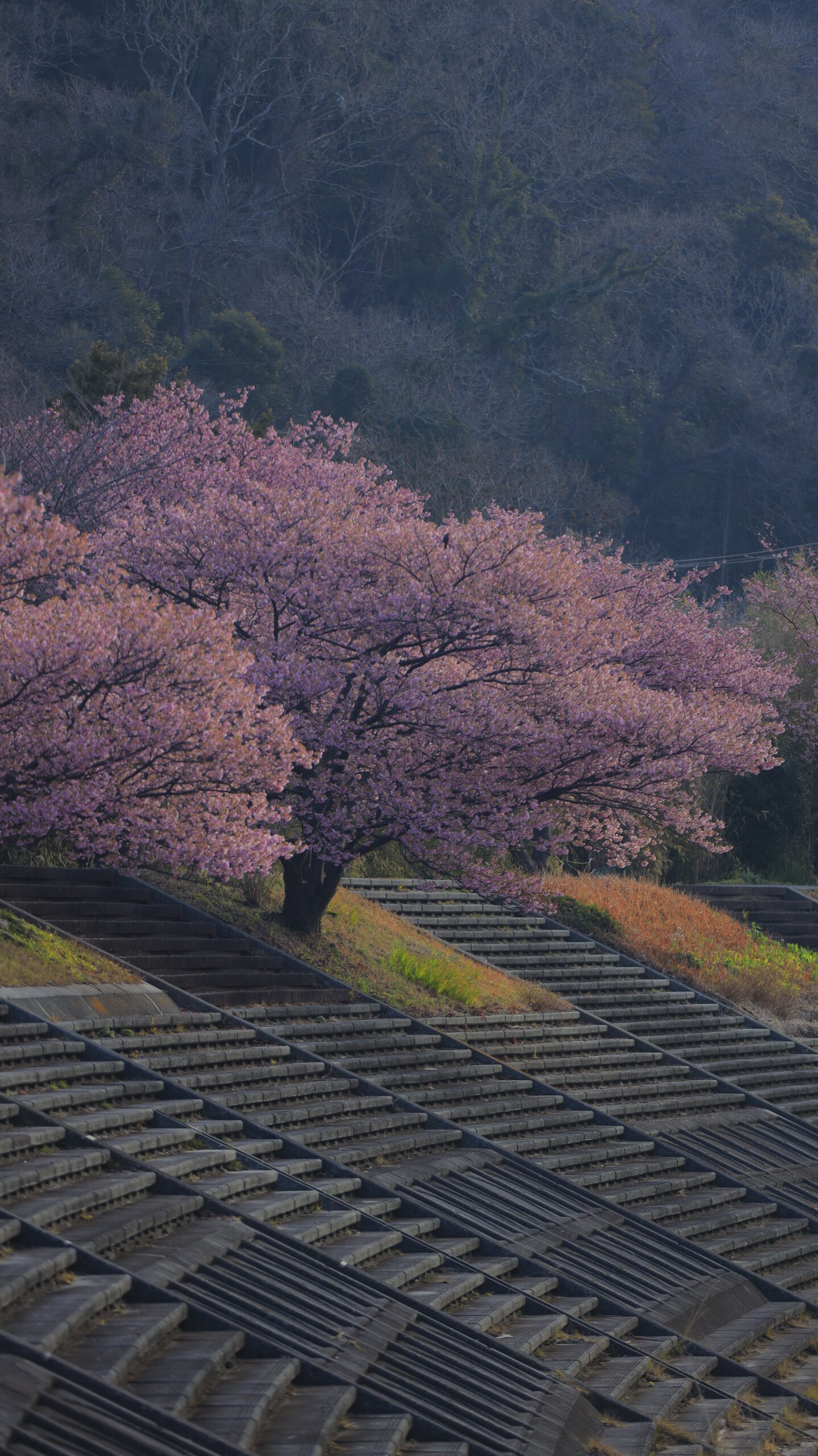 この写真は、みなみの桜と菜の花まつり(南伊豆町)で、太陽が雲に隠れた瞬間にわずかな光が差し込む河津桜と階段をとらえたものです。