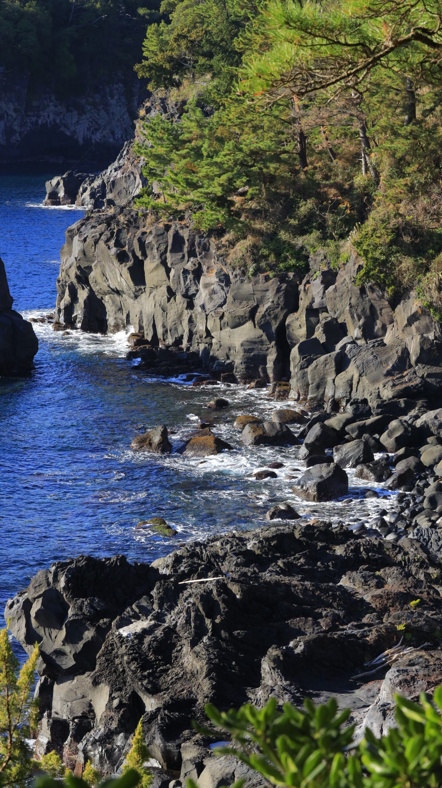 この写真は、城ヶ崎海岸で、岩がゴツゴツとした海岸の様子を撮影したものです。