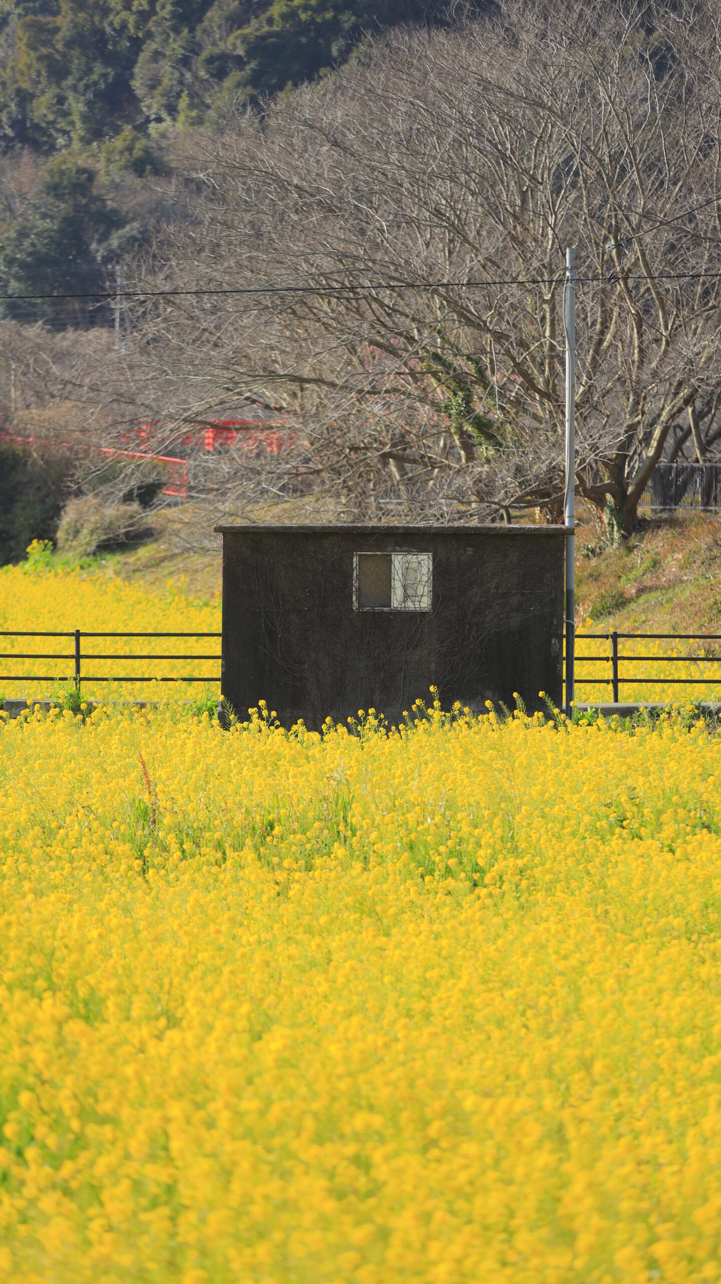この写真は、みなみの桜と菜の花まつり(南伊豆町)で、菜の花畑と小さな建物を組み合わせ、広がりある春景色を奥行きを意識して撮影しました。
