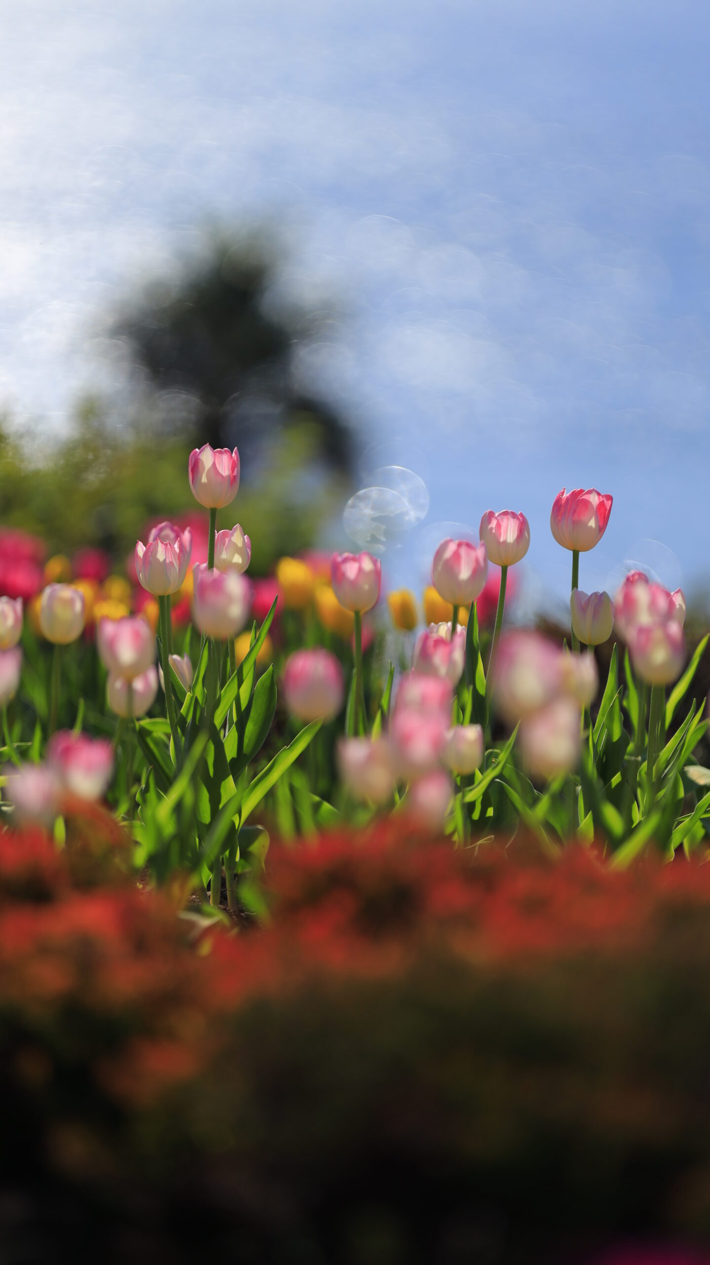 この写真は、ニューヨークランプミュージアム&フラワーガーデンで、綺麗なアイスチューリップを少し大きめに見せつつ、海も入るように構図を整えて撮影してみました。