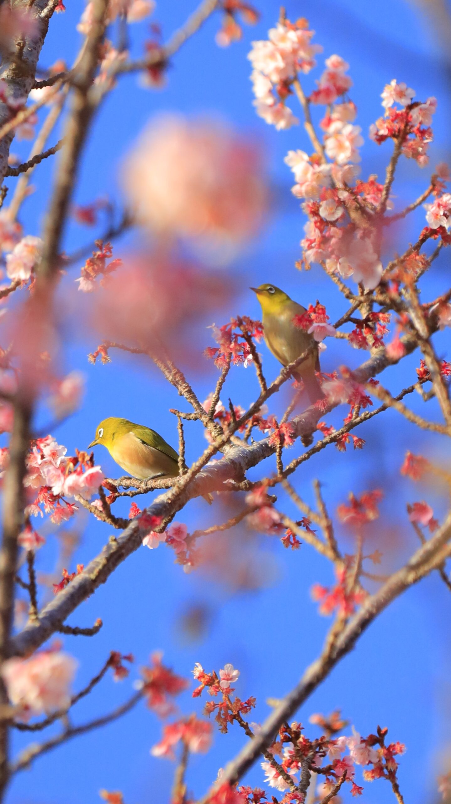 この写真は、抱湖園(南房総)で、二羽のメジロが桜の枝に仲良くとまる様子を撮影したものです。