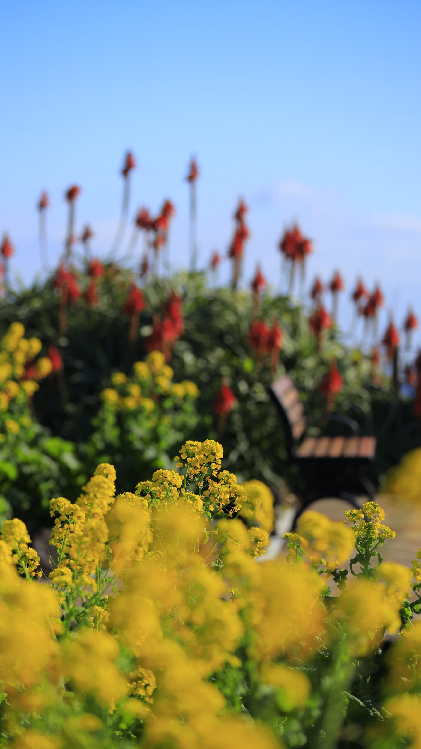 この写真は、ニューヨークランプミュージアム&フラワーガーデンで、アロエの花を背景にして菜の花を撮影したものです。