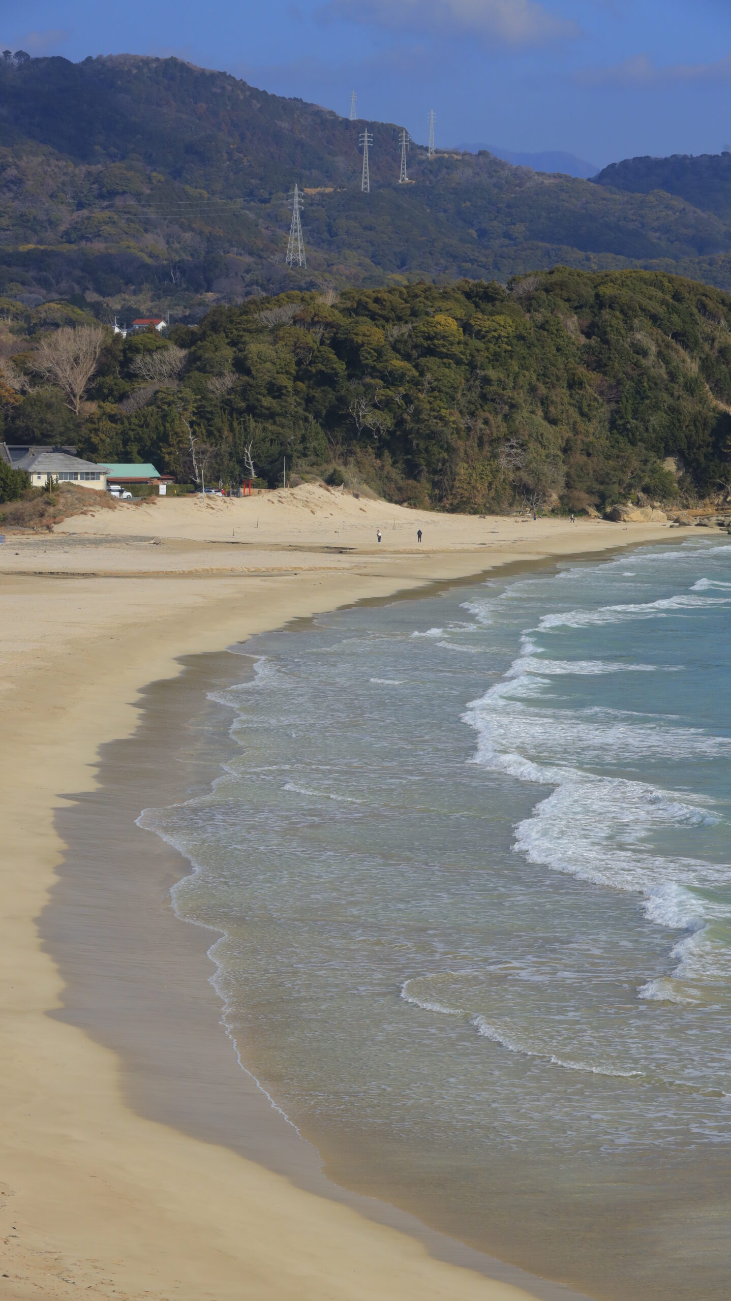この写真は、白浜海岸で、白砂と青い海が広がるビーチ全体の様子を撮影したものです。