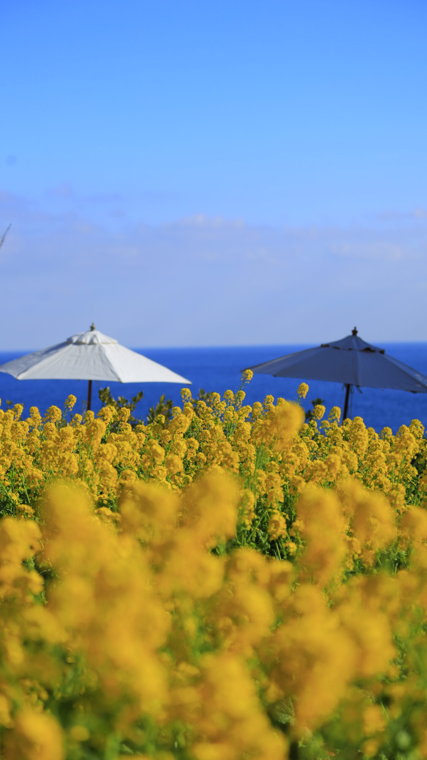 この写真は、ニューヨークランプミュージアム&フラワーガーデンで、菜の花と白いパラソルの様子を中心に撮影したものです。