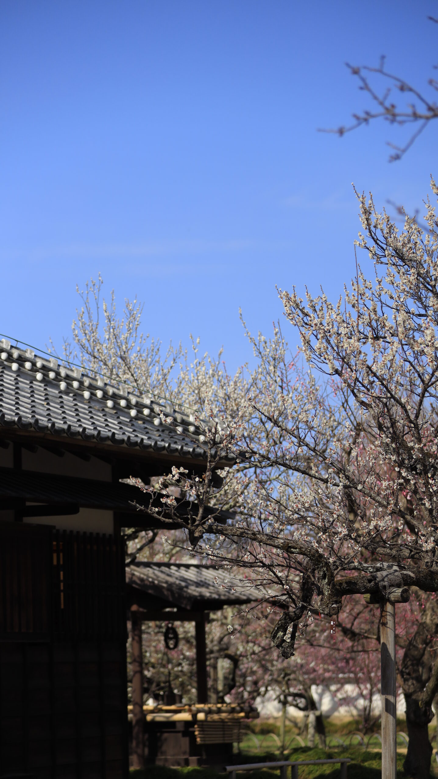 この写真は、弘道館で、建物とその隣にある梅の木を撮影したものです。建物の落ち着いた雰囲気と梅の花の華やかさが対比になり、印象的な景色になっています。