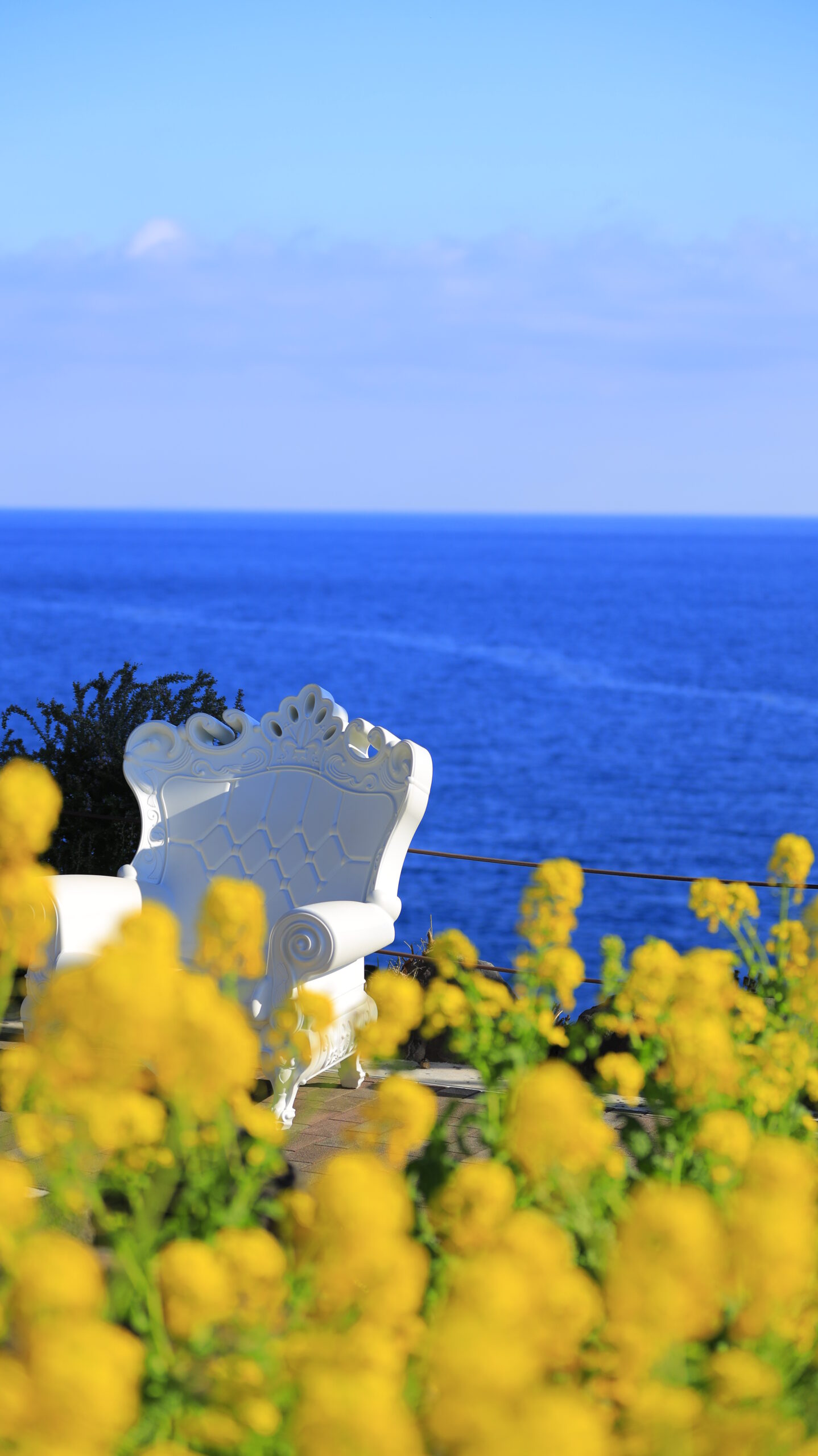 この写真は、ニューヨークランプミュージアム&フラワーガーデンで、青い海と菜の花と椅子の様子を、白い椅子にピントをあわせて撮影したものです。