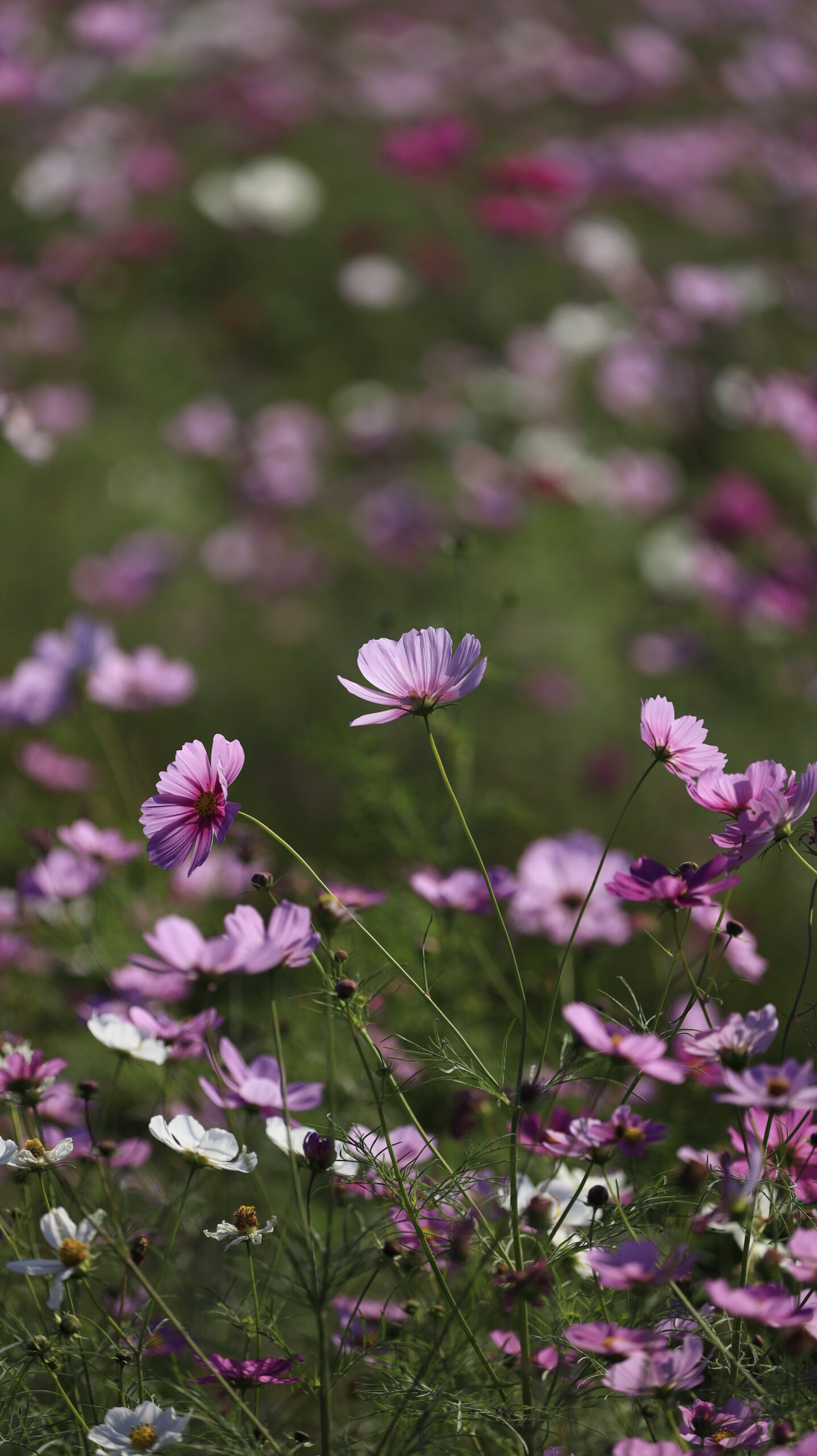 この写真は、足立区都市農業公園で、ピンク色に輝くコスモスの花の美しさを撮影したものです。優しい光に包まれた花びらが印象的です。