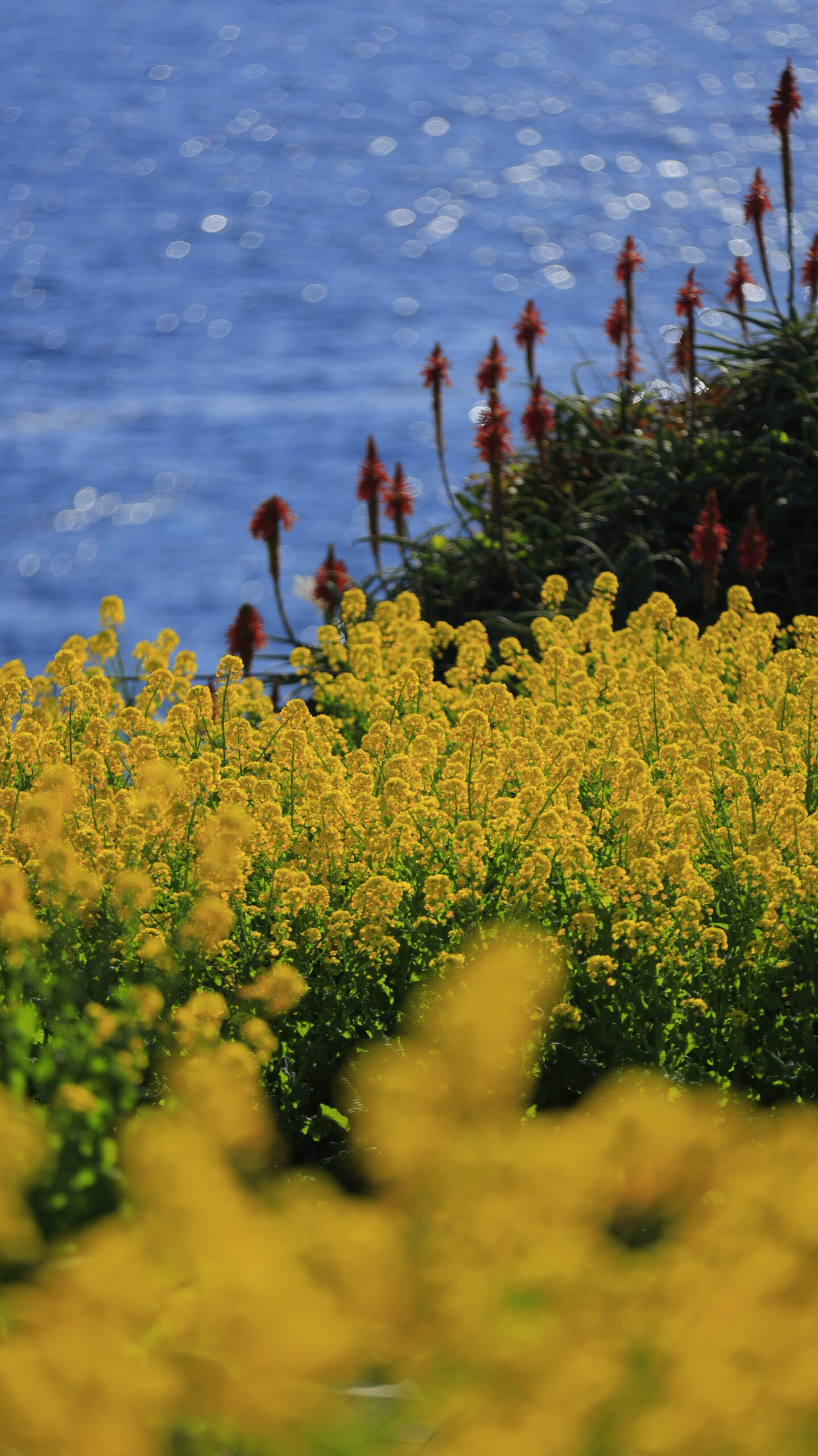 この写真は、ニューヨークランプミュージアム&フラワーガーデンで、菜の花、アロエの花、海の様子を一緒に撮影したものです。