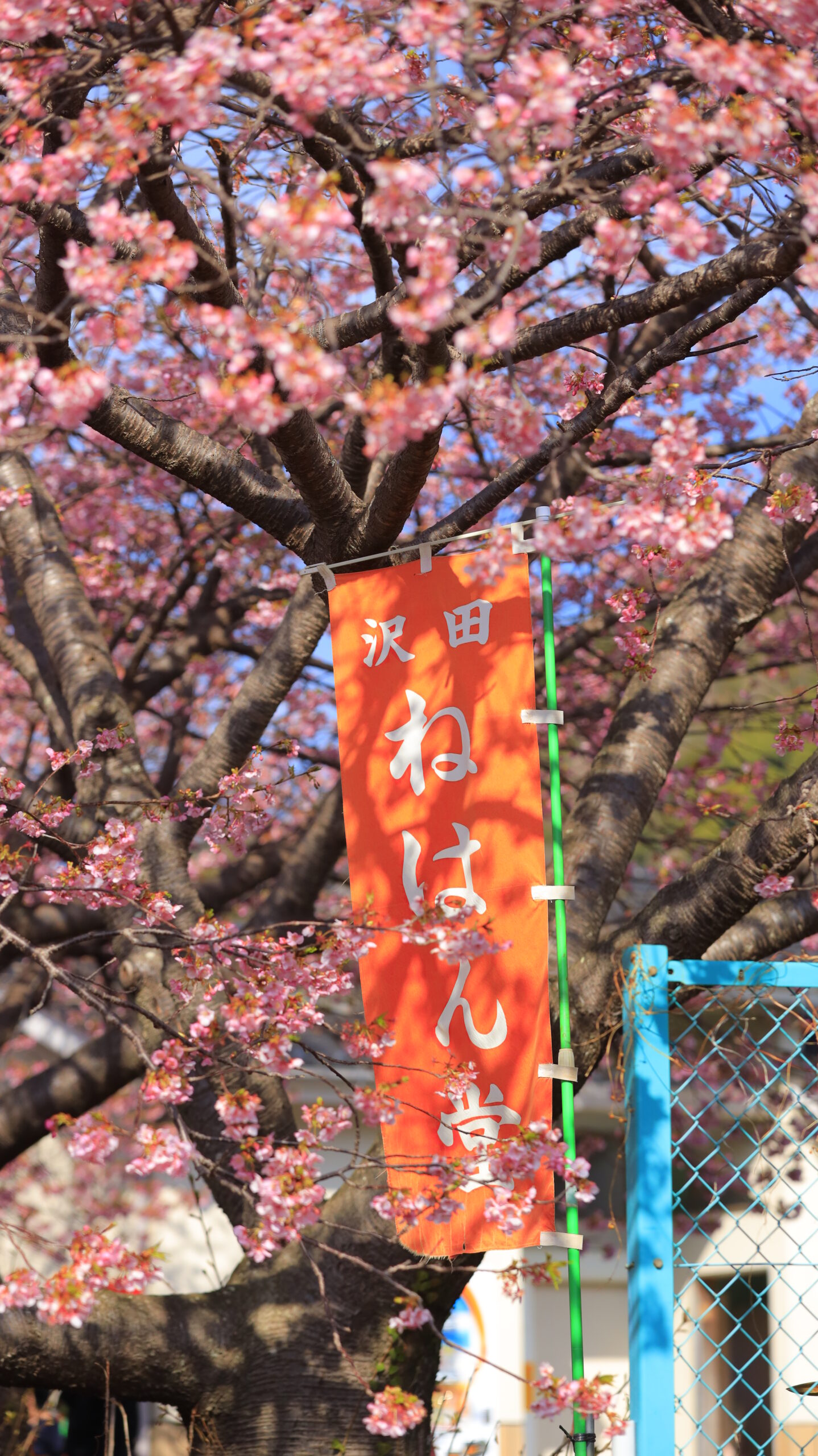 この写真は、河津桜まつり(河津町)で、河津桜とのぼり旗、緑のフェンスの配置を意識して撮影し、祭りらしい雰囲気を表現しました。