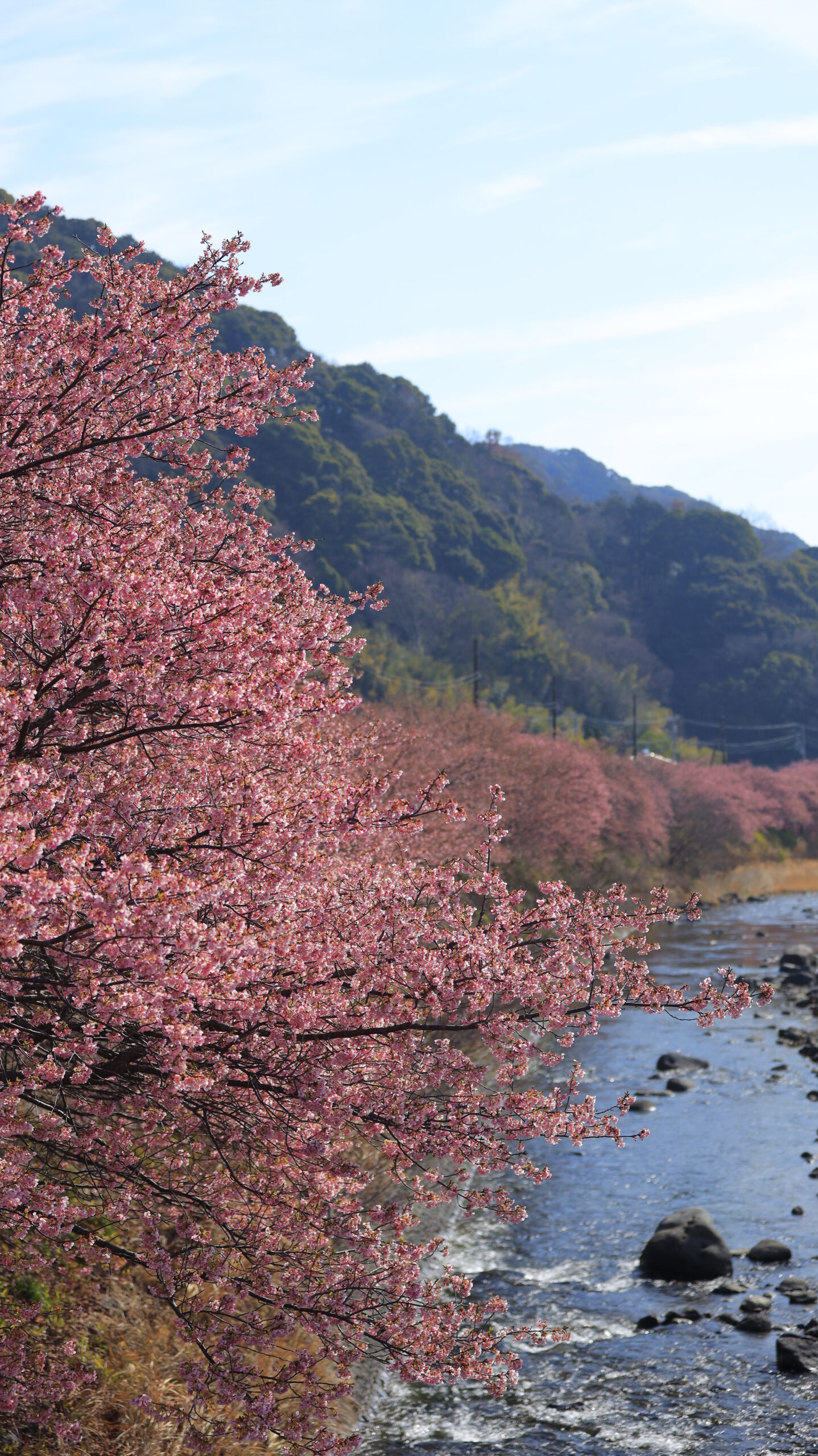 この写真は、河津桜まつり(河津町)で、河津川沿いに咲き誇る河津桜の様子を川の奥行きを意識して撮影したもので、続いていく桜並木のスケール感と春の広がりを表現した一枚です。