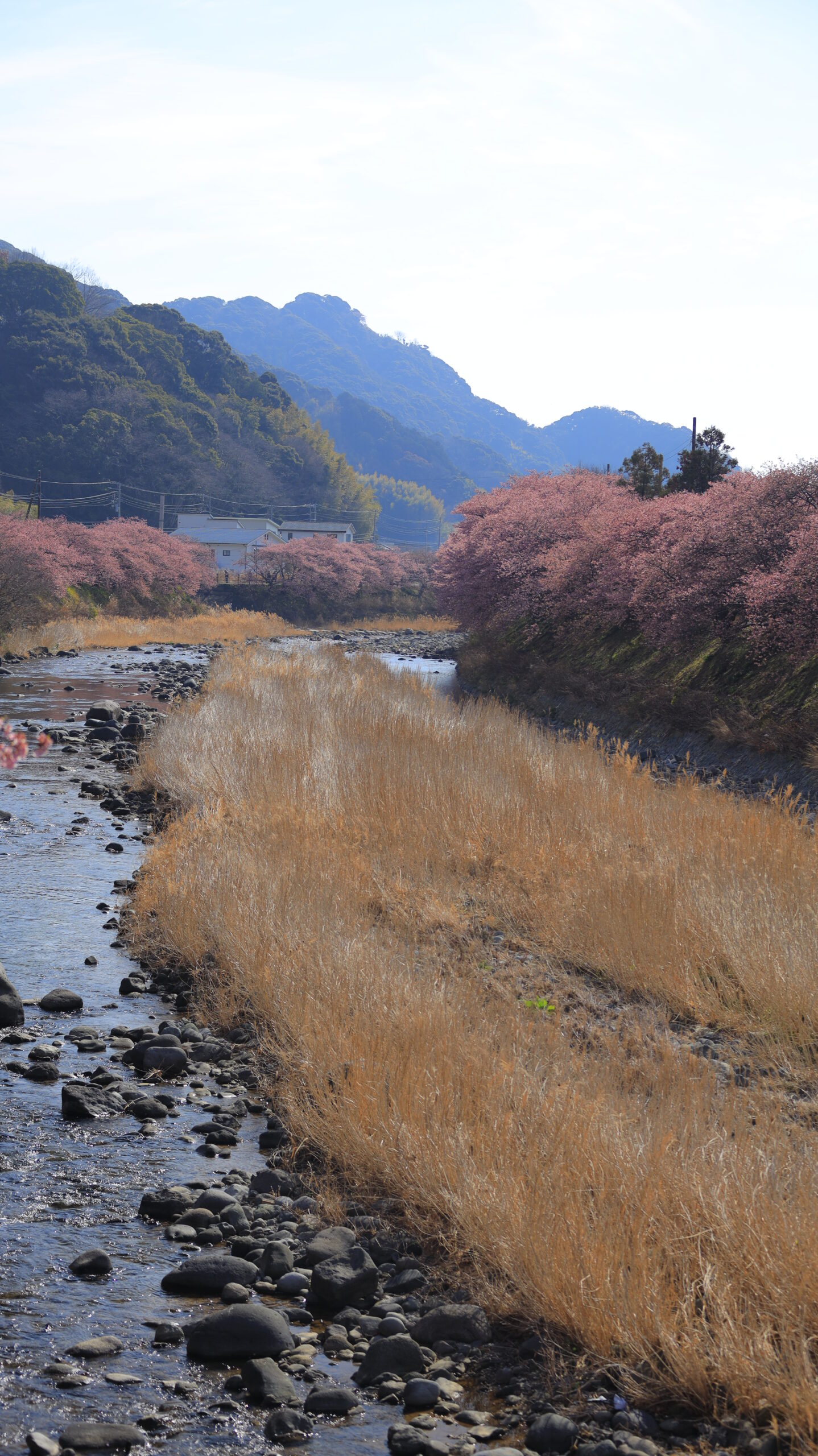 この写真は、河津桜まつり(河津町)で、逆光の光を活かしながら河津川と河津桜を撮影したもので、透ける花びらと川面の輝きを印象的に仕上げています。