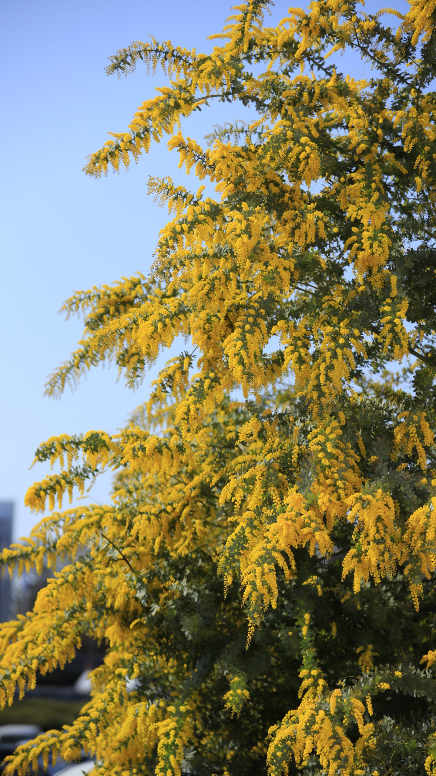 この写真は、茨城県内で、大きく育ったミモザの木が全体に入るように撮影したものです。枝いっぱいに広がる黄色い花がとても華やかで、春の訪れを感じさせる景色になっています。