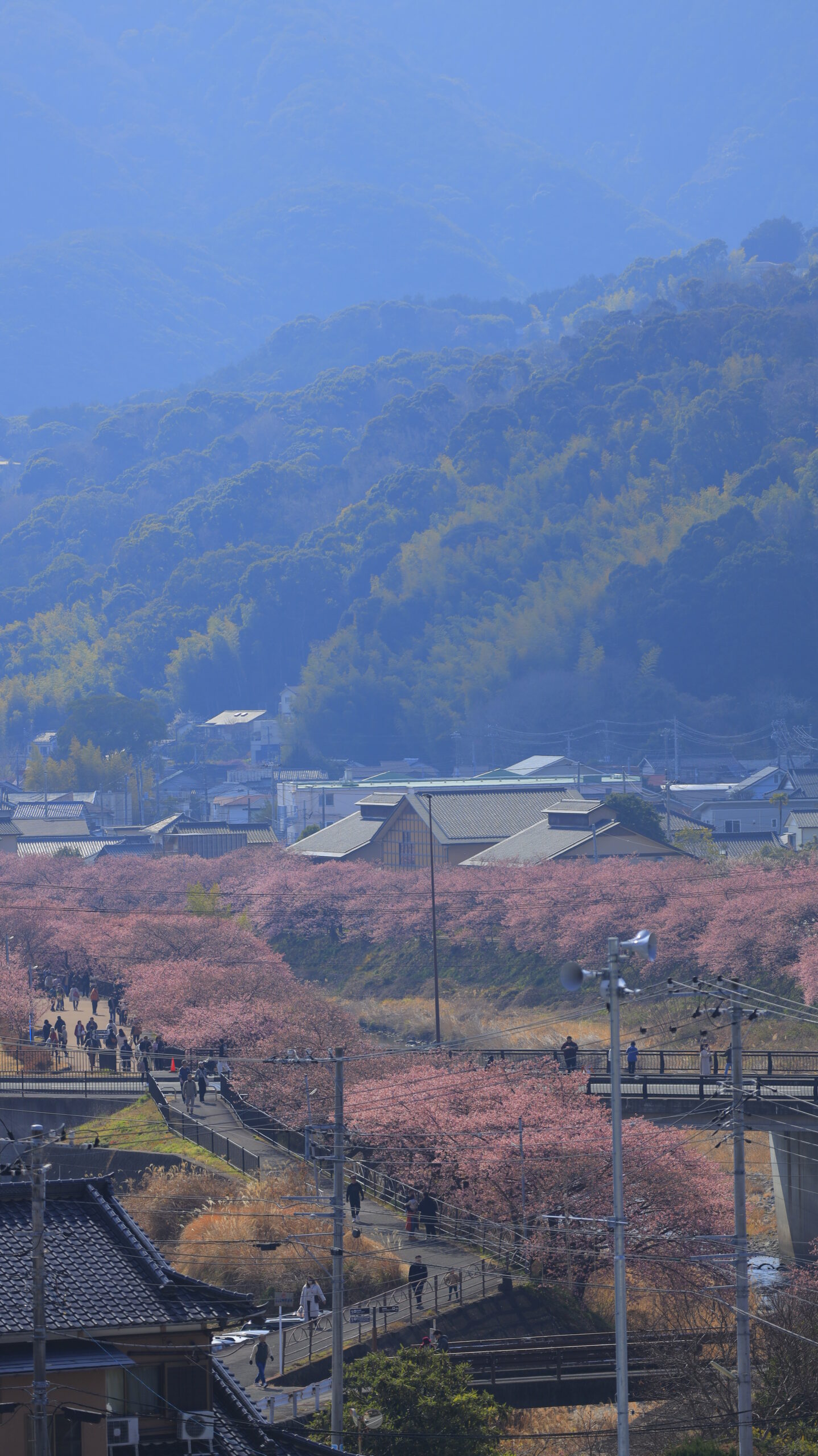 この写真は、河津桜まつり(河津町)で、見晴らし台から奥まで続く河津桜並木を撮影したもので、河津川沿いの壮大な桜のトンネルを表現しました。