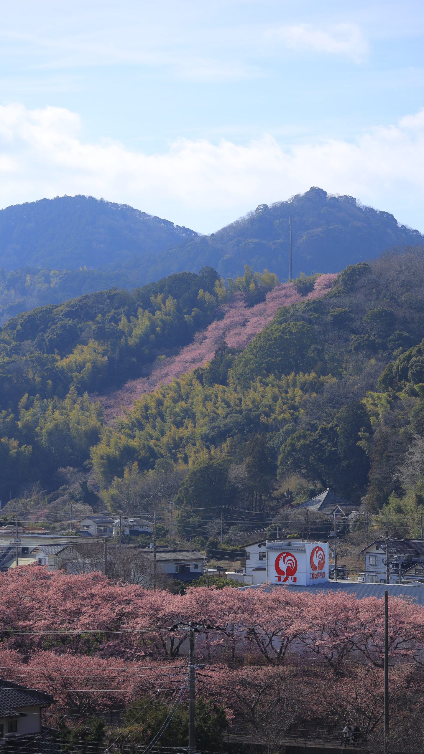 この写真は、河津桜まつり(河津町)で、高い位置から河津桜並木と山の桜を撮影したもので、町全体を包む春景色を俯瞰でとらえています。