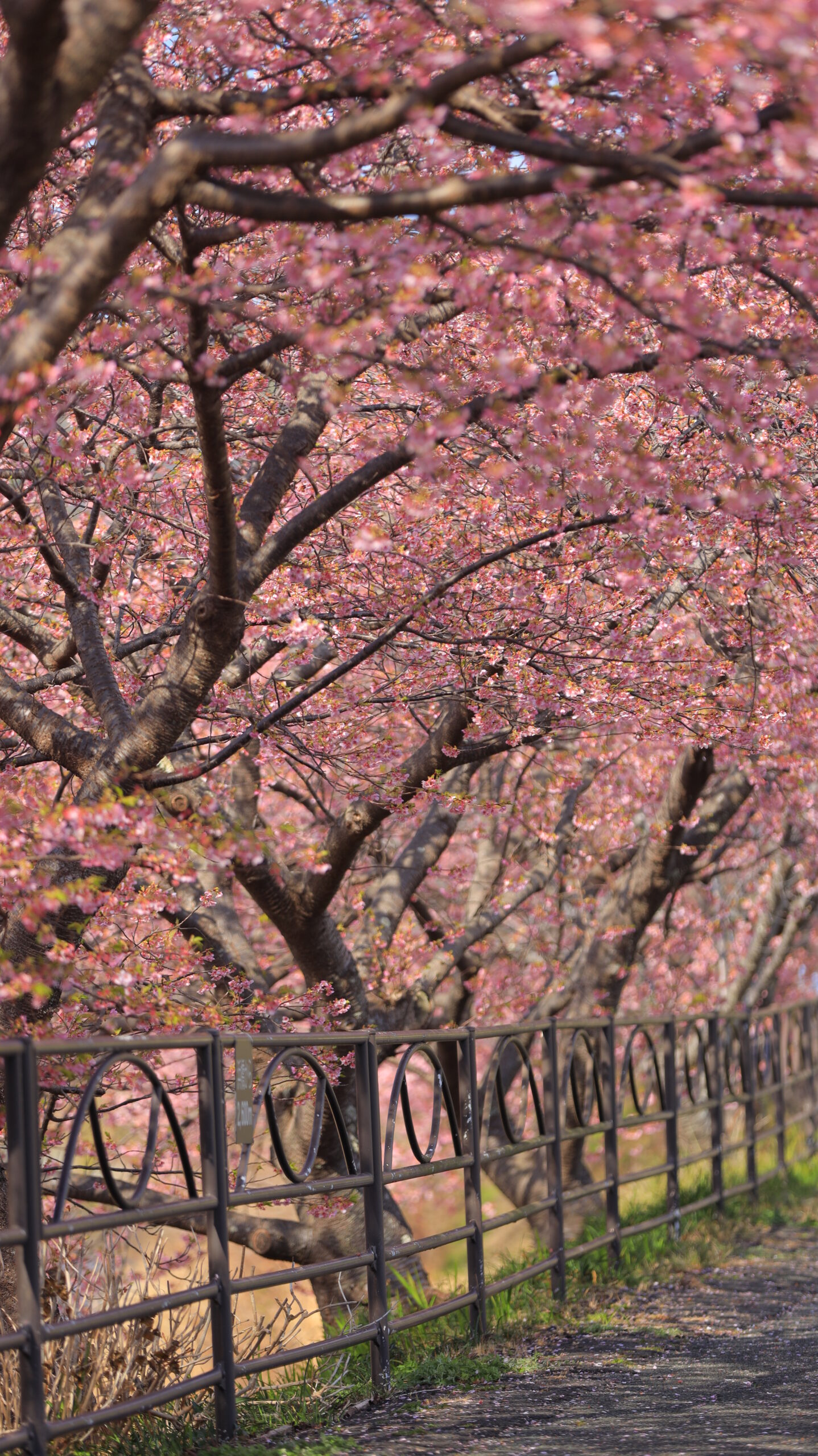 この写真は、河津桜まつり(河津町)で、土手沿いに続く河津桜並木の様子を撮影したもので、散策路として人気の風景を収めました。