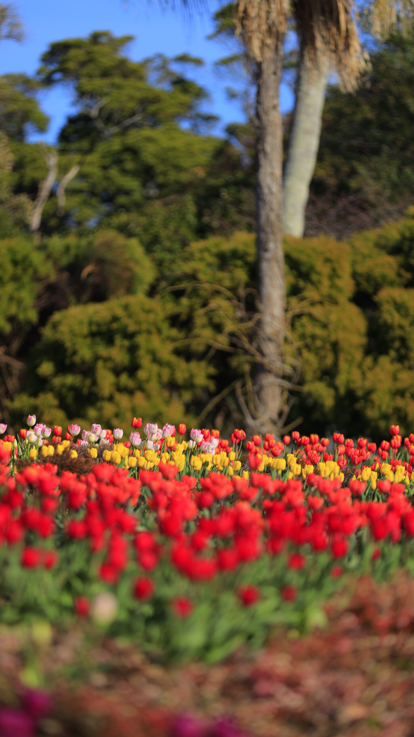 ニューヨークランプミュージアム&フラワーガーデンで、カラフルなアイスチューリップを低い位置から奥行きを意識して撮影した画像