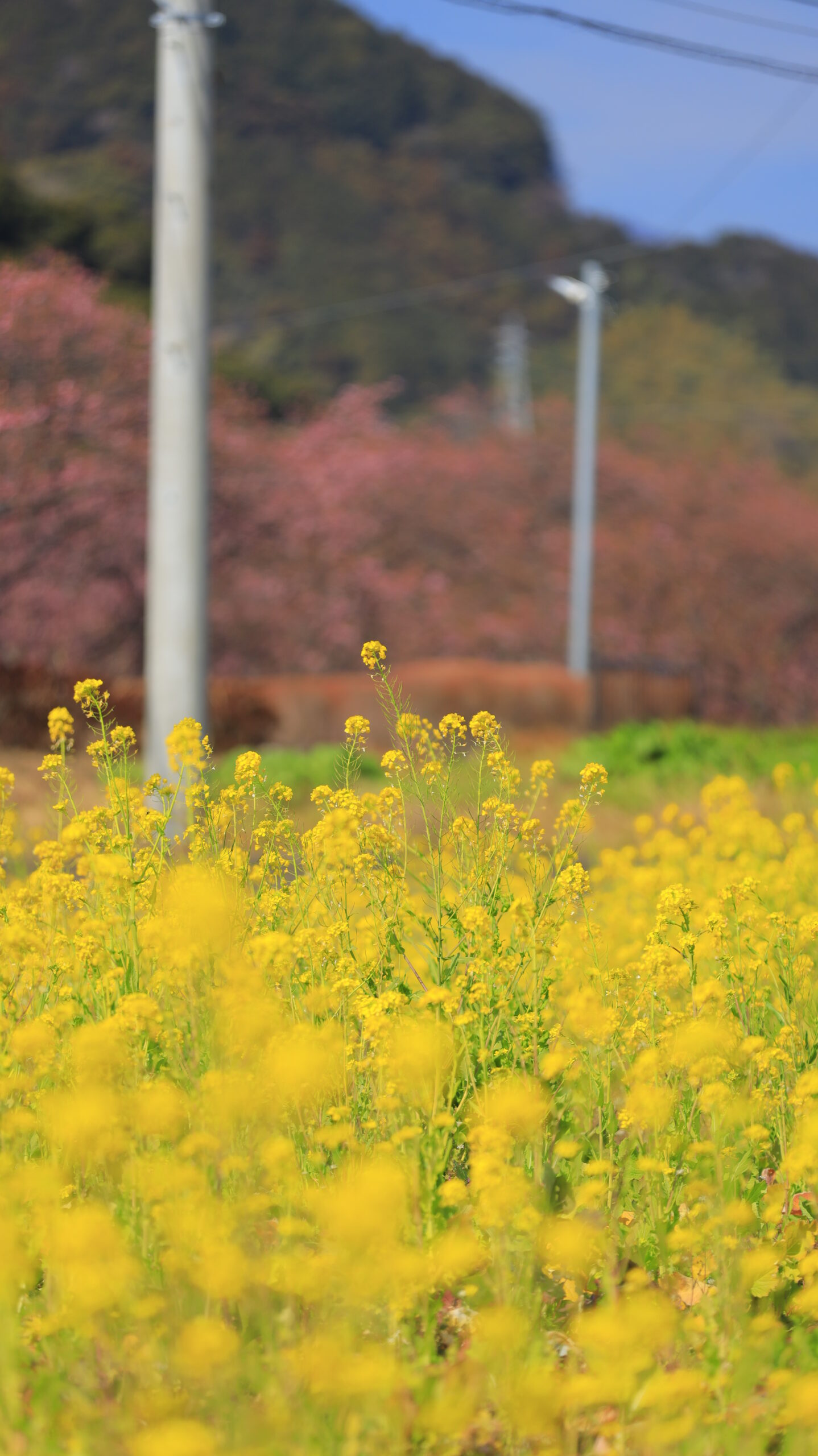 この写真は、河津桜まつり(河津町)で、河津桜を背景に無数に咲く菜の花が光る様子を撮影したもので、黄色とピンクのコントラストを楽しめる一枚です。