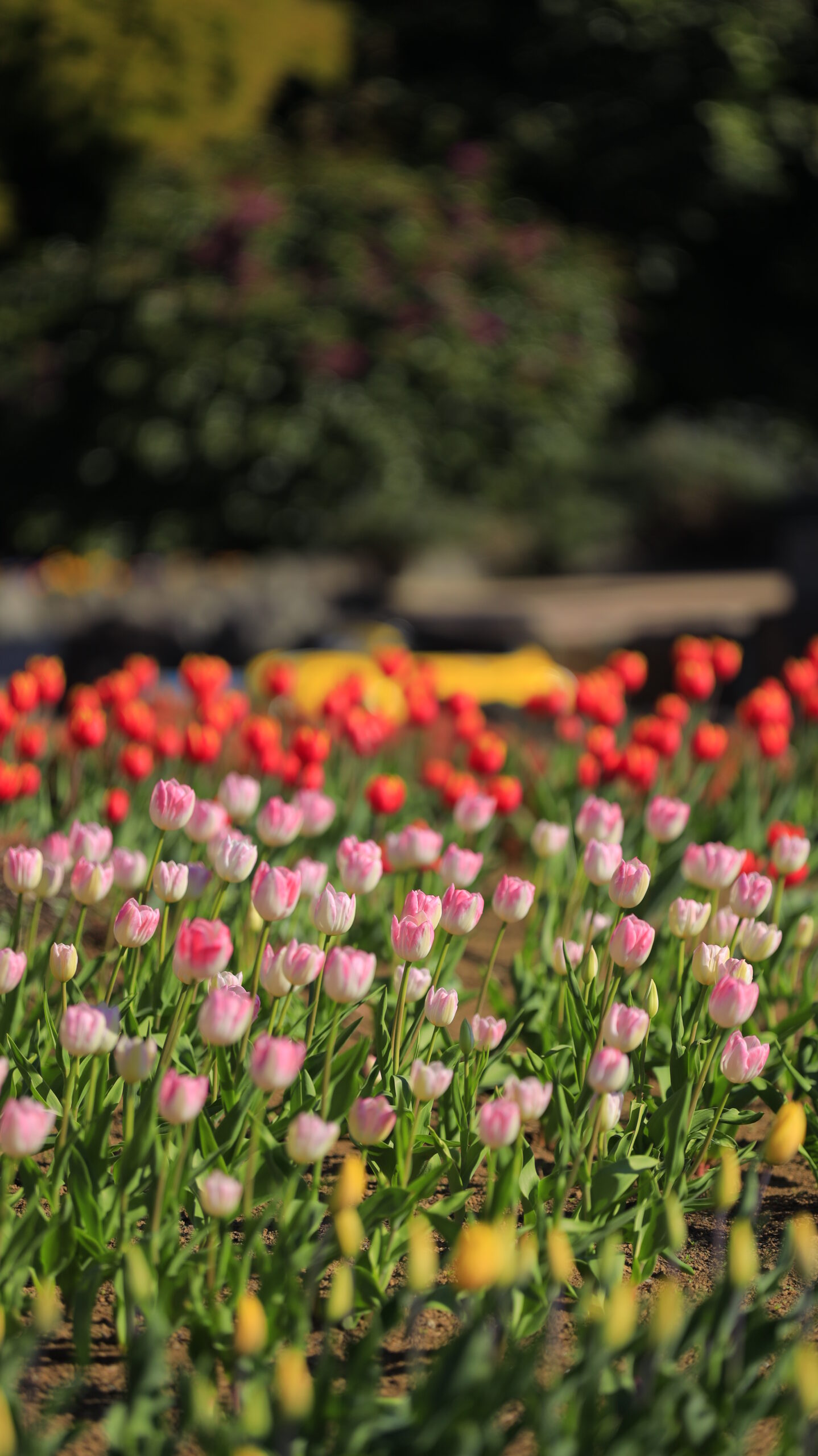 この写真は、ニューヨークランプミュージアム&フラワーガーデンで、薄ピンク色のアイスチューリップを低い位置から撮影したものです。