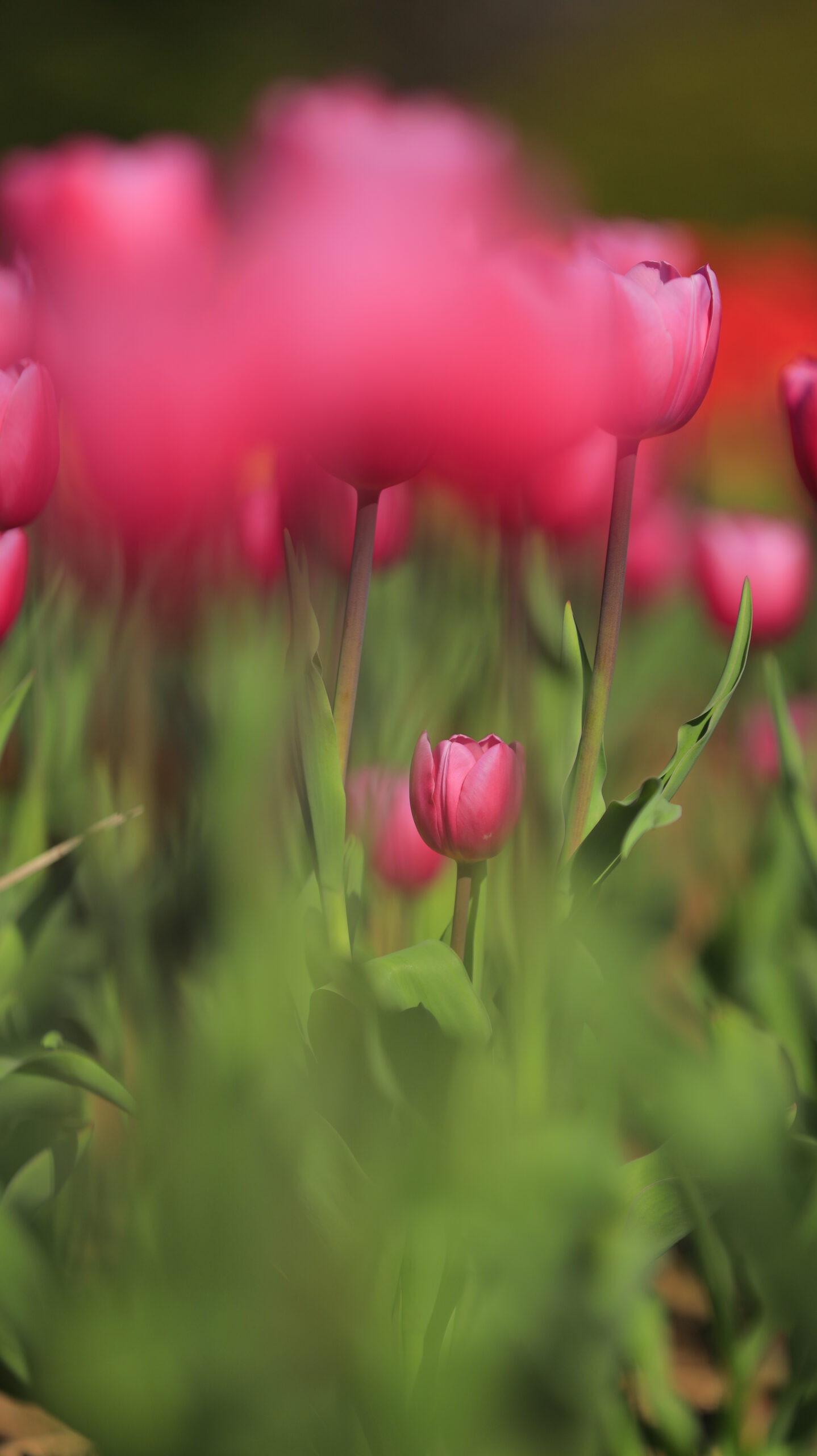 この写真は、ニューヨークランプミュージアム&フラワーガーデンで、花壇の中で背の低いアイスチューリップがちょこんとしている様子を撮影したものです。