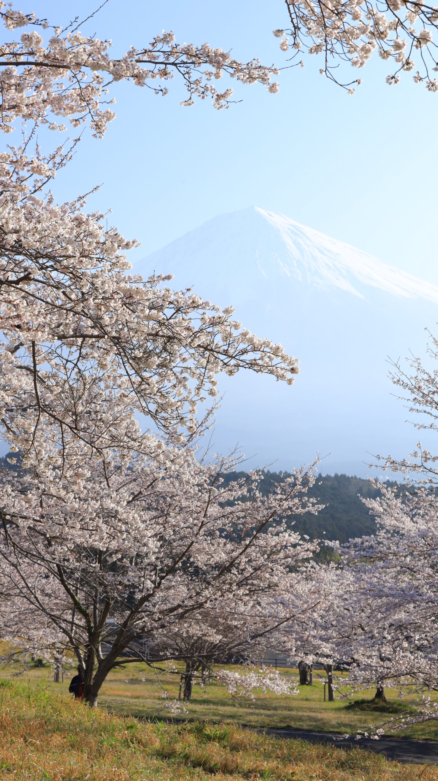 この写真は、常灯ヶ峰で、上から見下ろす形でソメイヨシノと遠くに薄く見える富士山を撮影したもので、広がりのある景色を表現しています。