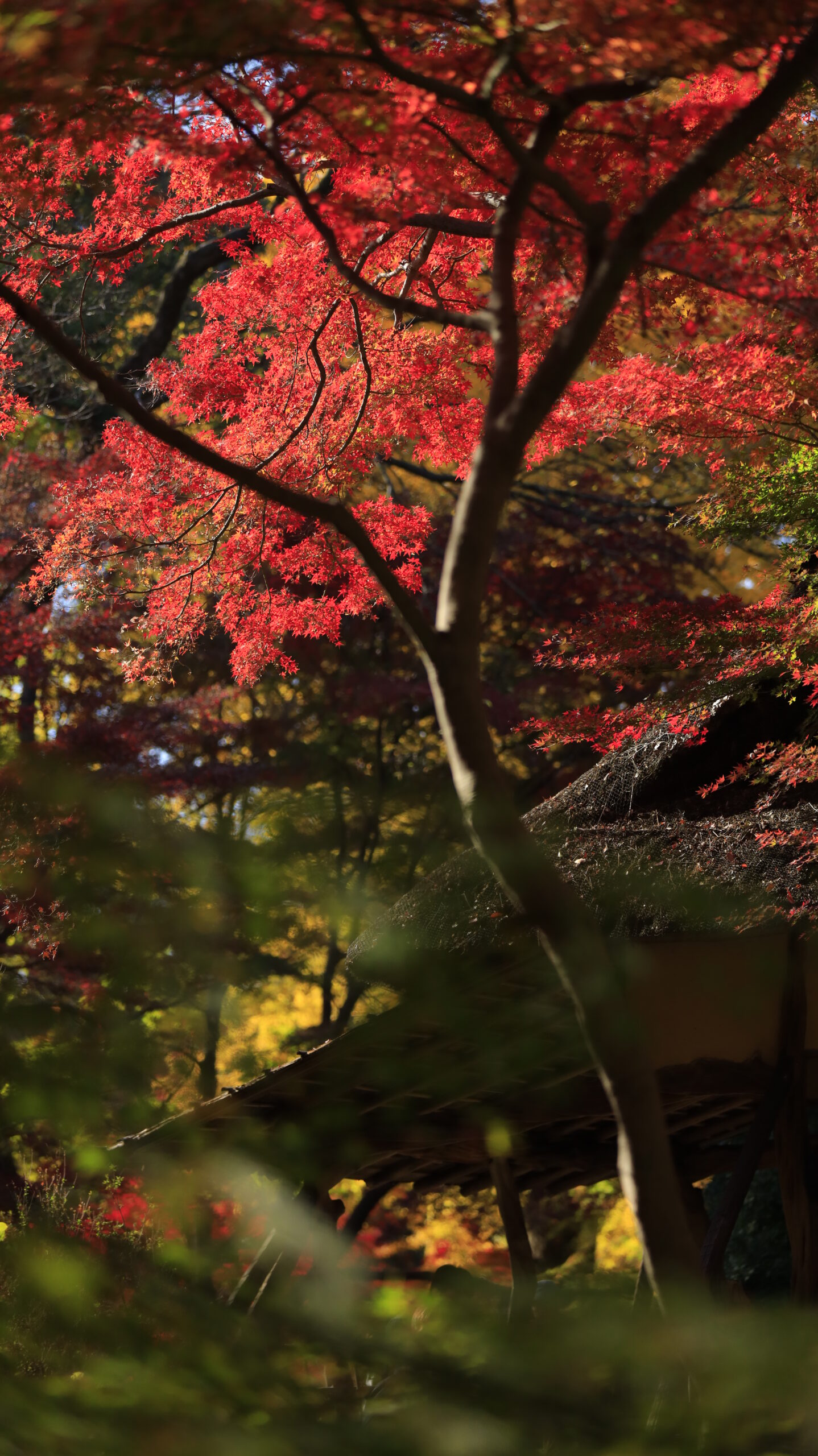 六義園で、藁葺き屋根の小屋周辺に密集するモミジの紅葉を切り取り、深みのある秋の庭園風景を表現した写真。
