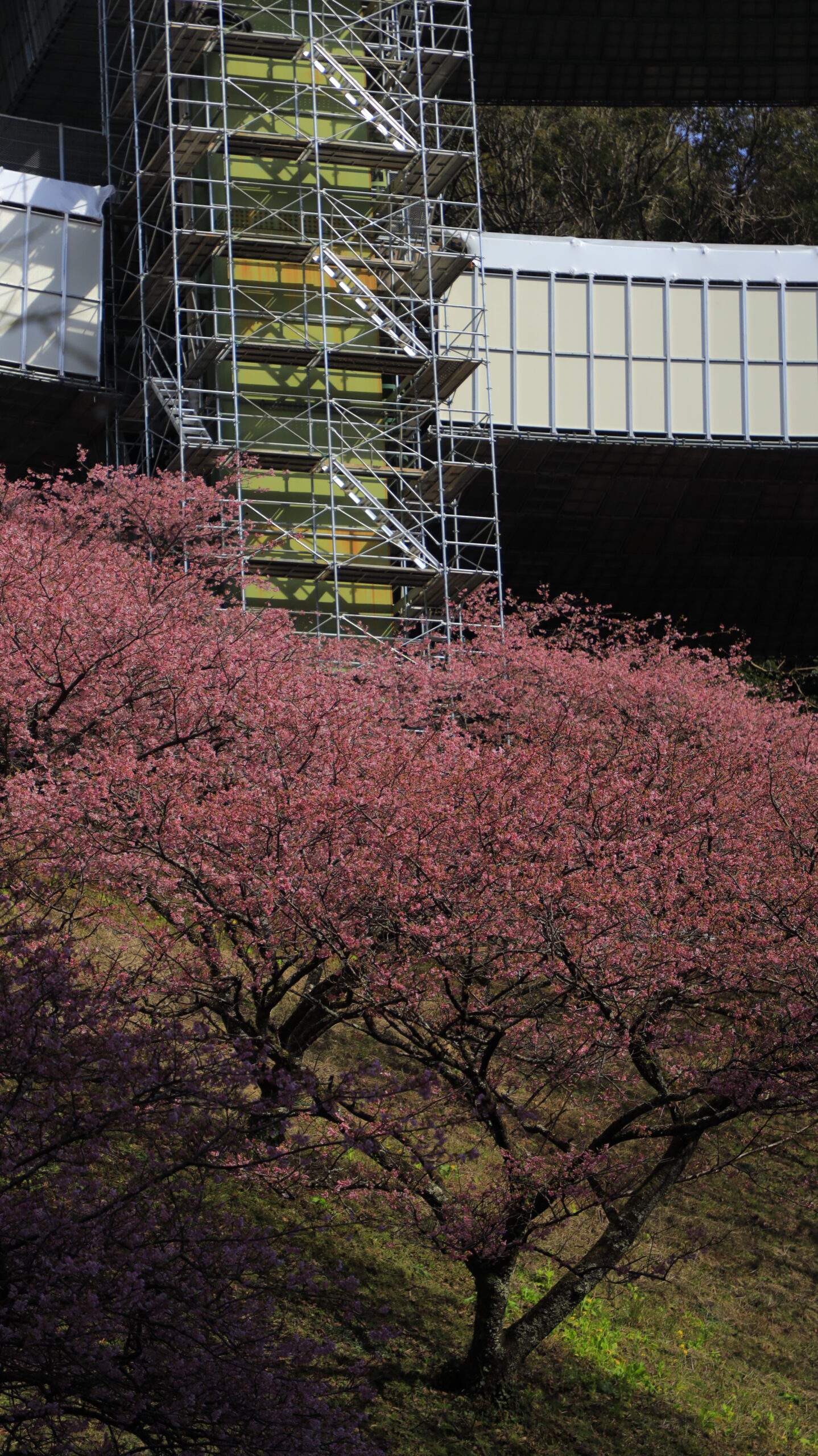 この写真は、河津七滝ループ橋で、改装中の橋桁とカワヅザクラを撮影し、人工物と自然の対比を表現しています。
