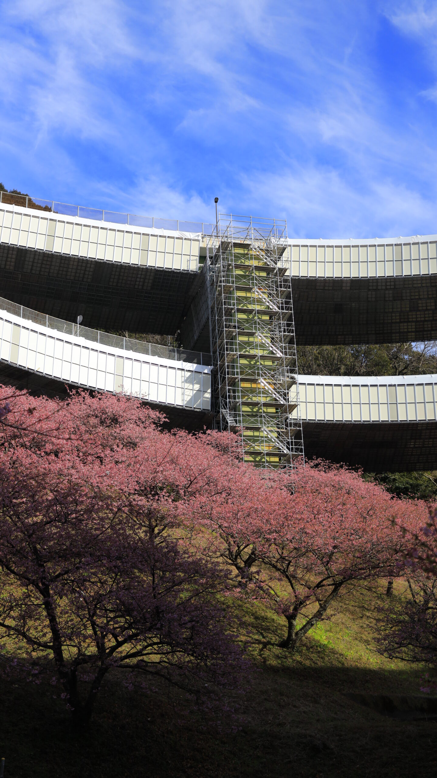 この写真は、河津七滝ループ橋で、ループ橋のカーブの曲線美と河津桜を撮影し、ダイナミックな構図に仕上げました。