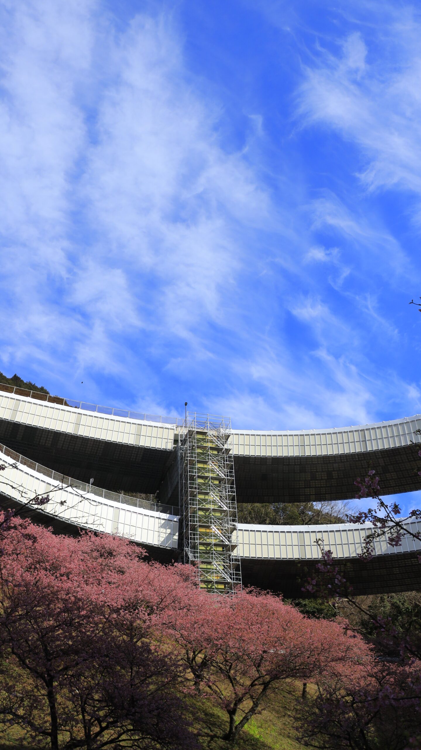 この写真は、河津七滝ループ橋で、広角レンズを使いループ橋とカワヅザクラを撮影し、迫力ある遠近感を強調しています。