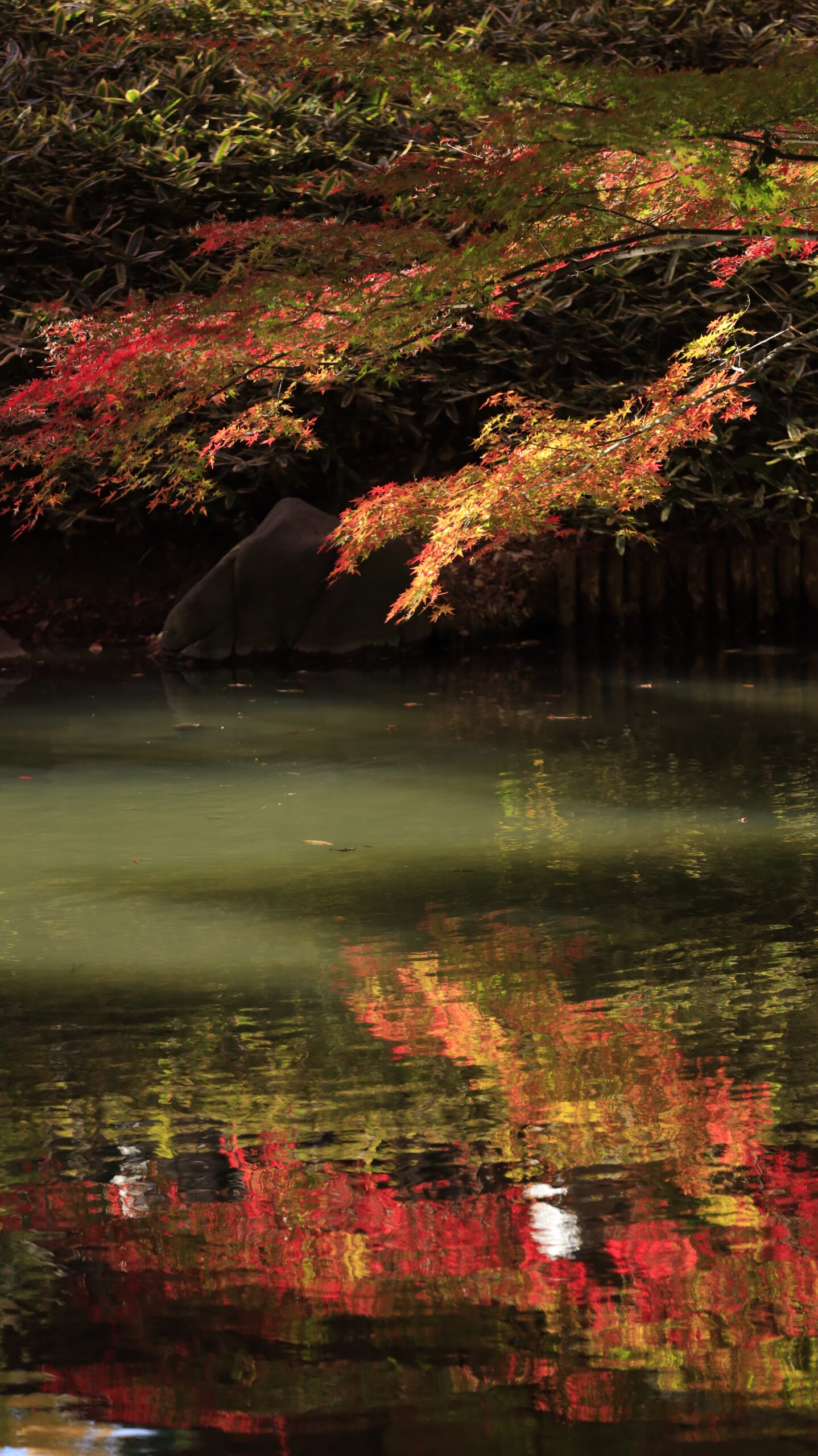 この写真は、六義園で、綺麗なモミジに光が当たり、その色が水面に反射する様子を撮影したものです。揺らめく水面と光を受けた紅葉が幻想的で、詩的な雰囲気が漂います。