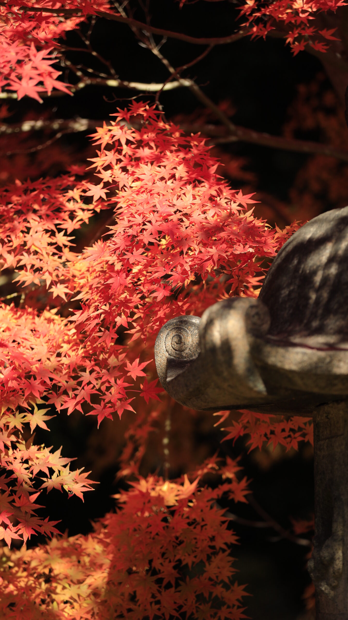 この写真は、六義園で、石の灯籠へモミジの葉がかぶさる様子を撮影したものです。灯籠の落ち着いた質感と鮮やかな紅葉の対比が美しく、和の風情が漂う一枚です。