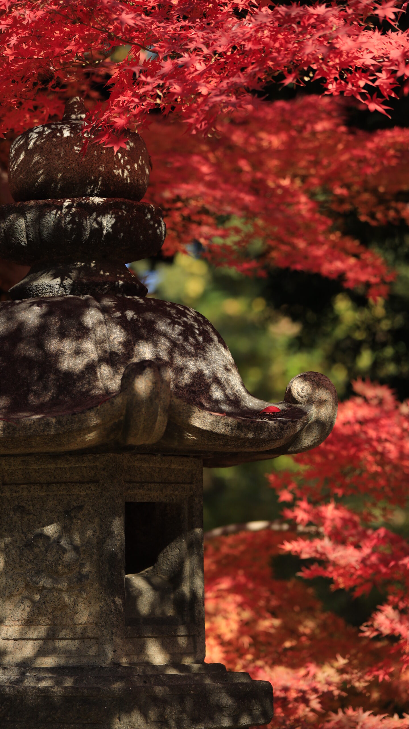 この写真は、六義園で、モミジの紅葉を背景に石の灯籠を撮影し、光と影を意識したものです。光がつくる陰影が深みを生み、庭園の歴史を感じるような表情が広がっています。