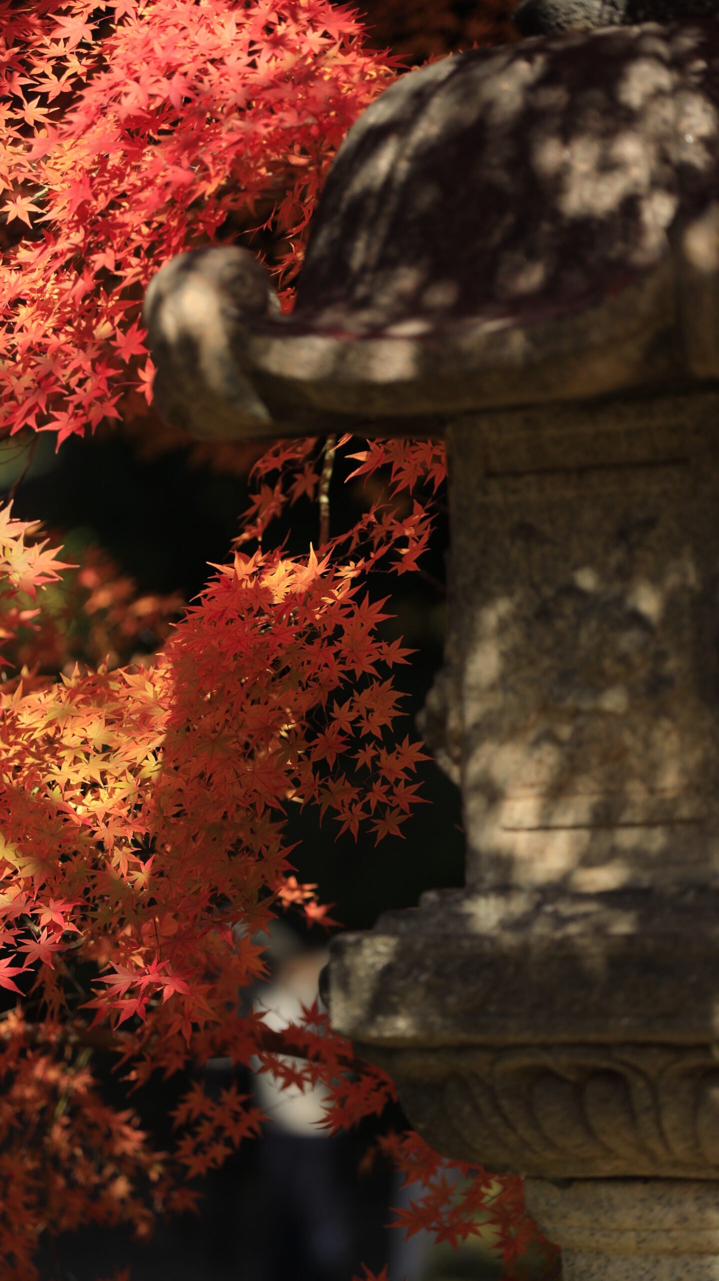 この写真は、六義園で、石の灯籠周辺に広がる綺麗なモミジの葉を撮影したものです。赤と橙の鮮やかな色が重なり合い、庭園の落ち着いた景観へ華やかさを添えています。
