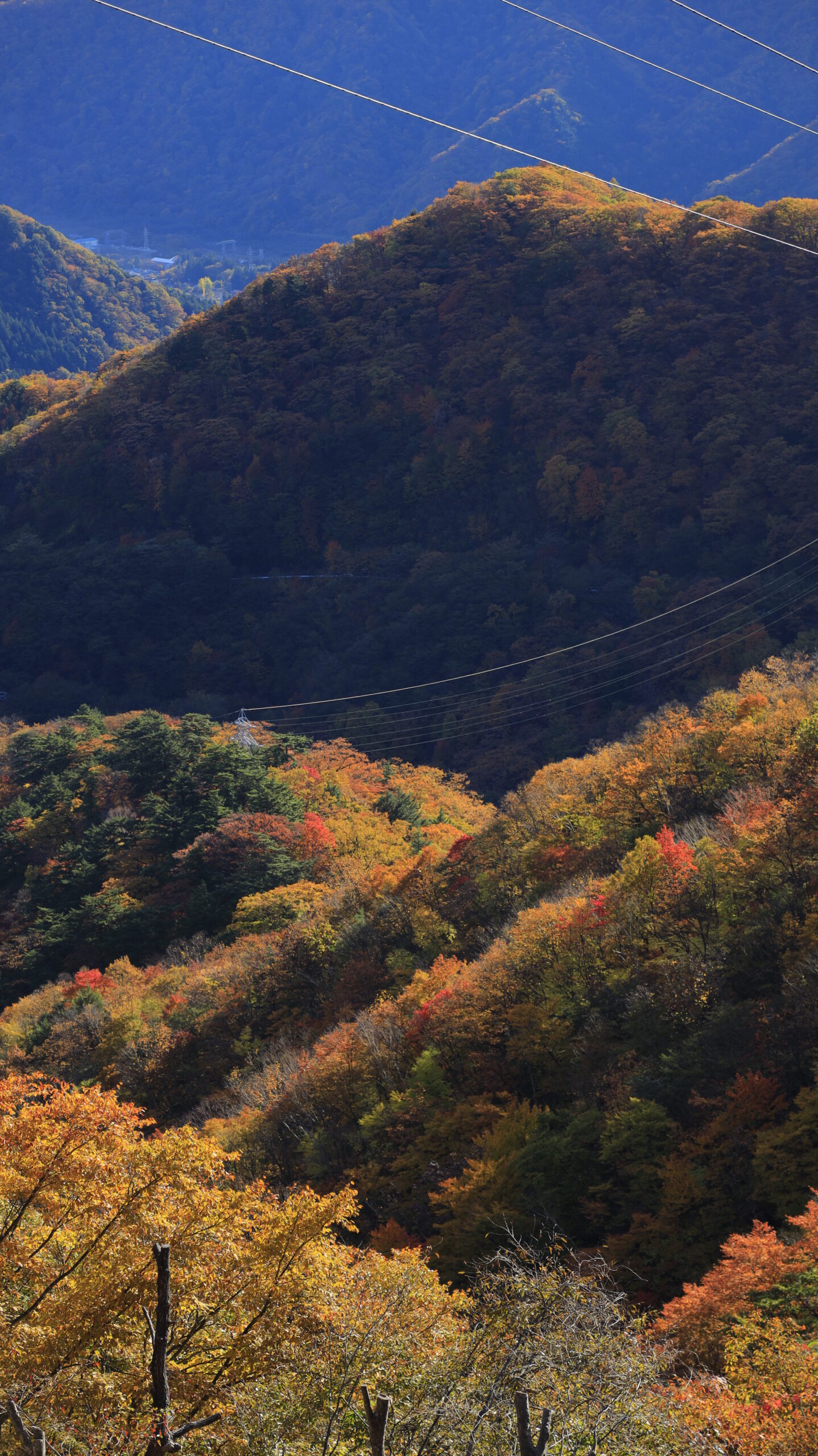 この写真は、明智平展望台で、駐車場に止める前の渋滞中に、下に広がる山々を撮影したものです。車中からでも迫力ある紅葉の景観を感じられます。
