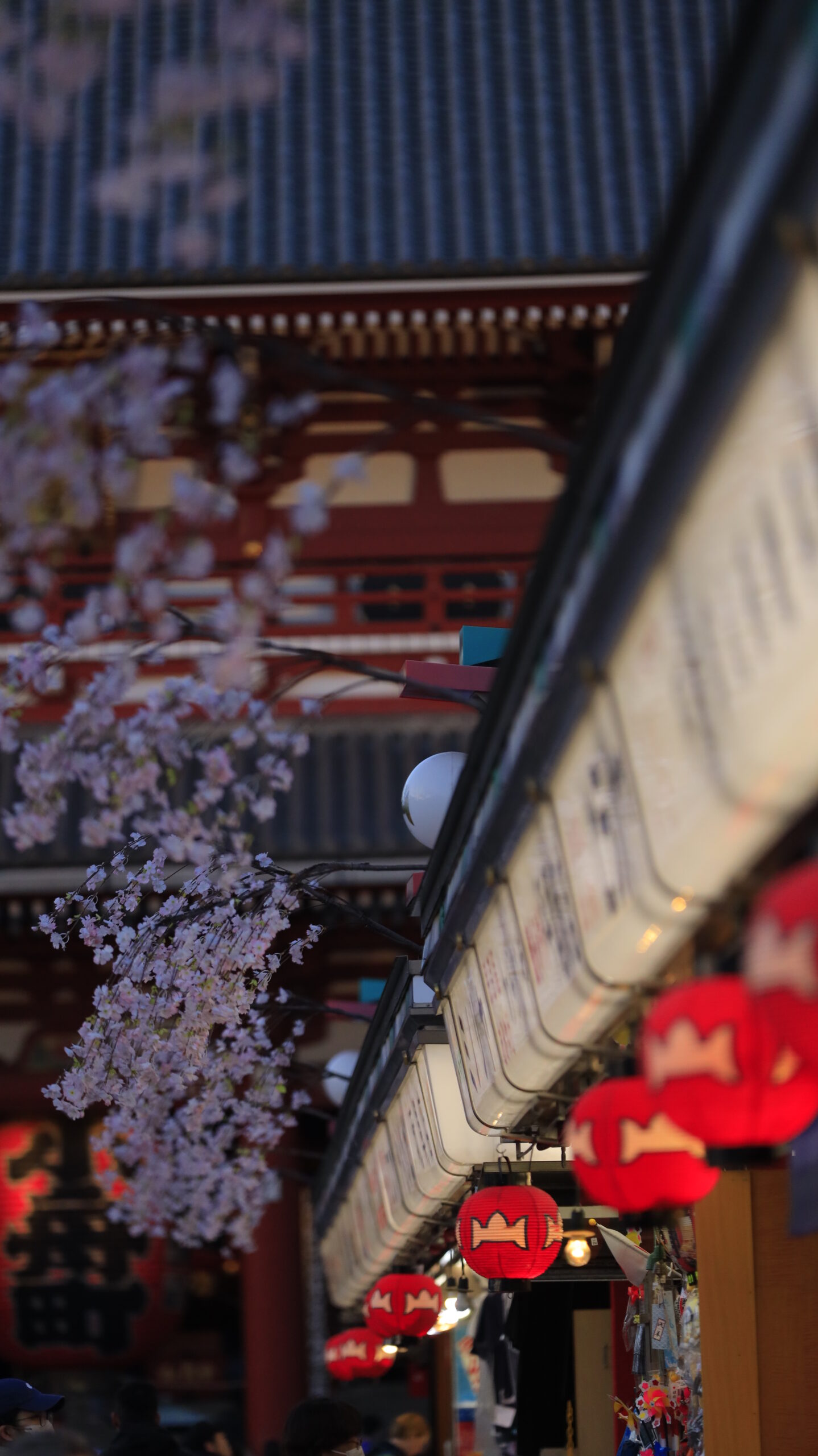 この写真は、浅草寺で、仲見世の装飾にピントを合わせながら、奥にある提灯をぼかすことで立体感を出すように撮影したものです。