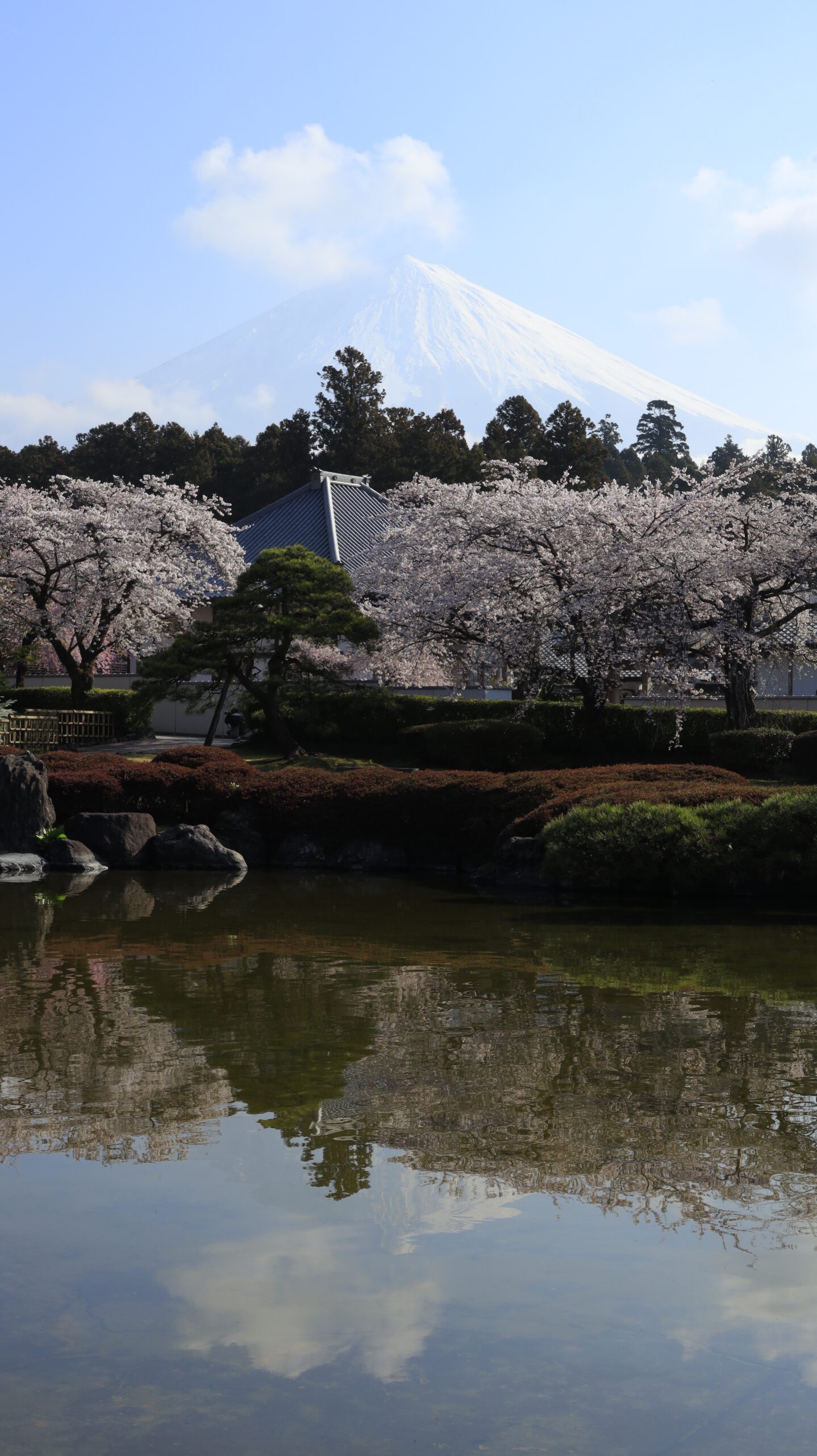 この写真は、大石寺で、池越しに見える満開のソメイヨシノと富士山のコラボレーションを撮影したものです。