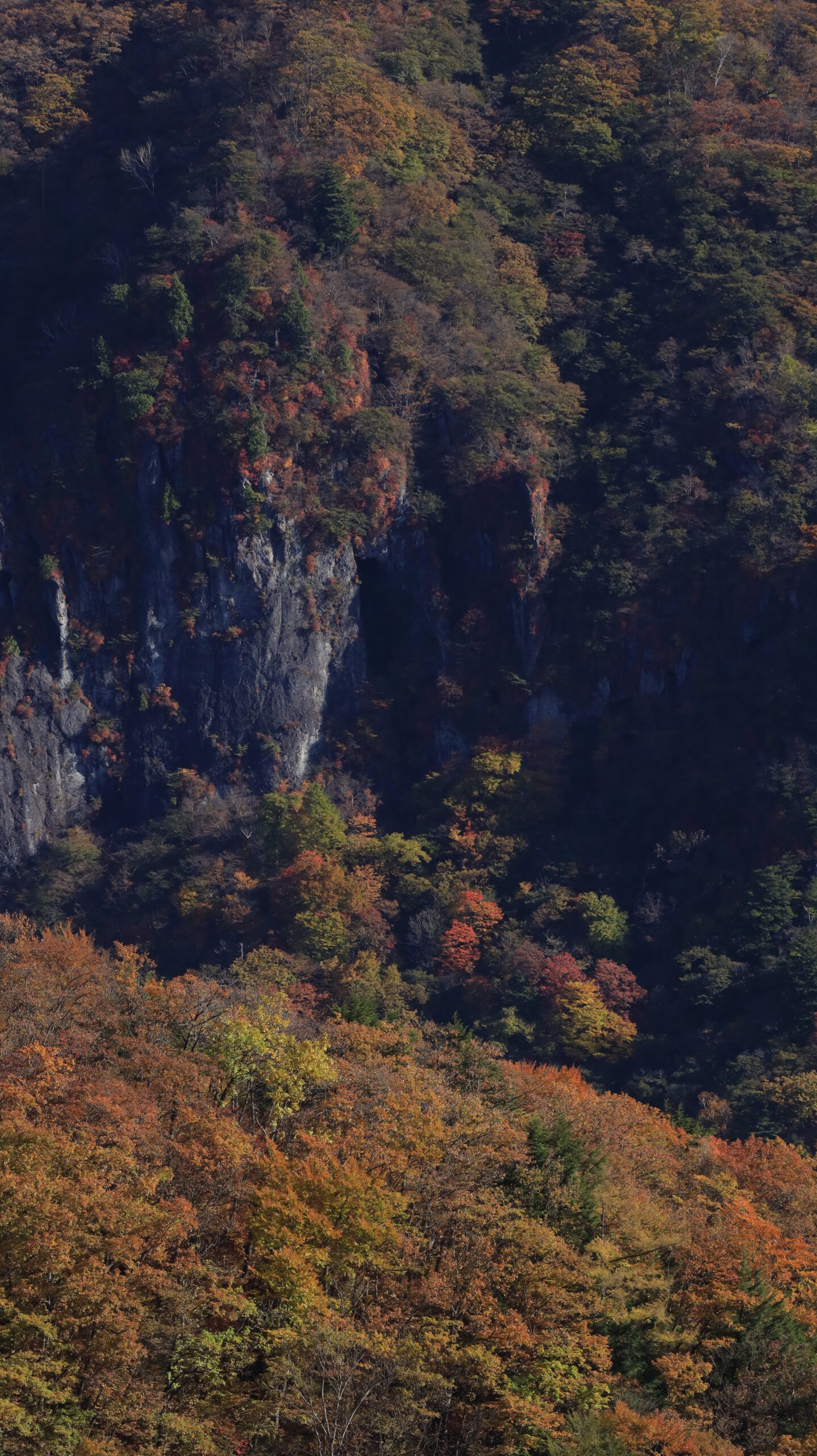 この写真は、明智平展望台で、駐車場からロープウェイに乗る前に、紅葉が美しい岩山を撮影したものです。自然の造形美が際立つ一枚です。
