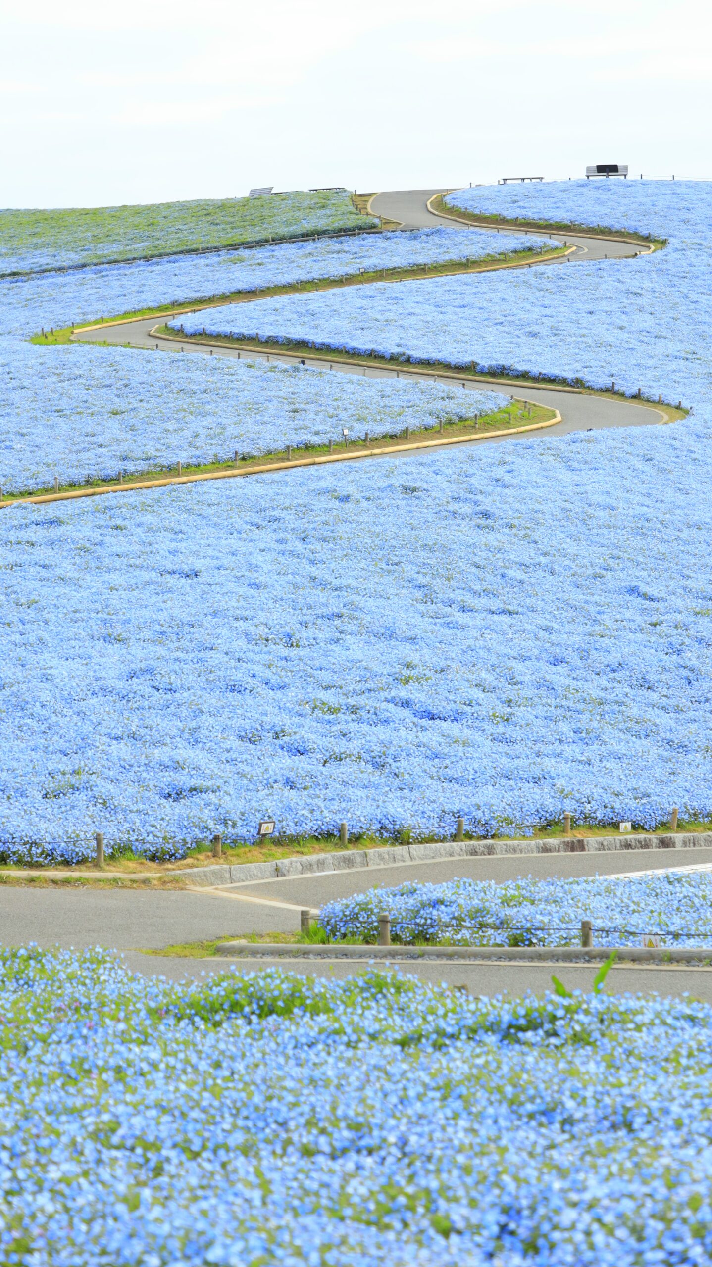 この写真は、国営ひたち海浜公園で、ネモフィラの丘のうねる小路と広がる花の様子を、タイミングを見計らいながら撮影したものです。