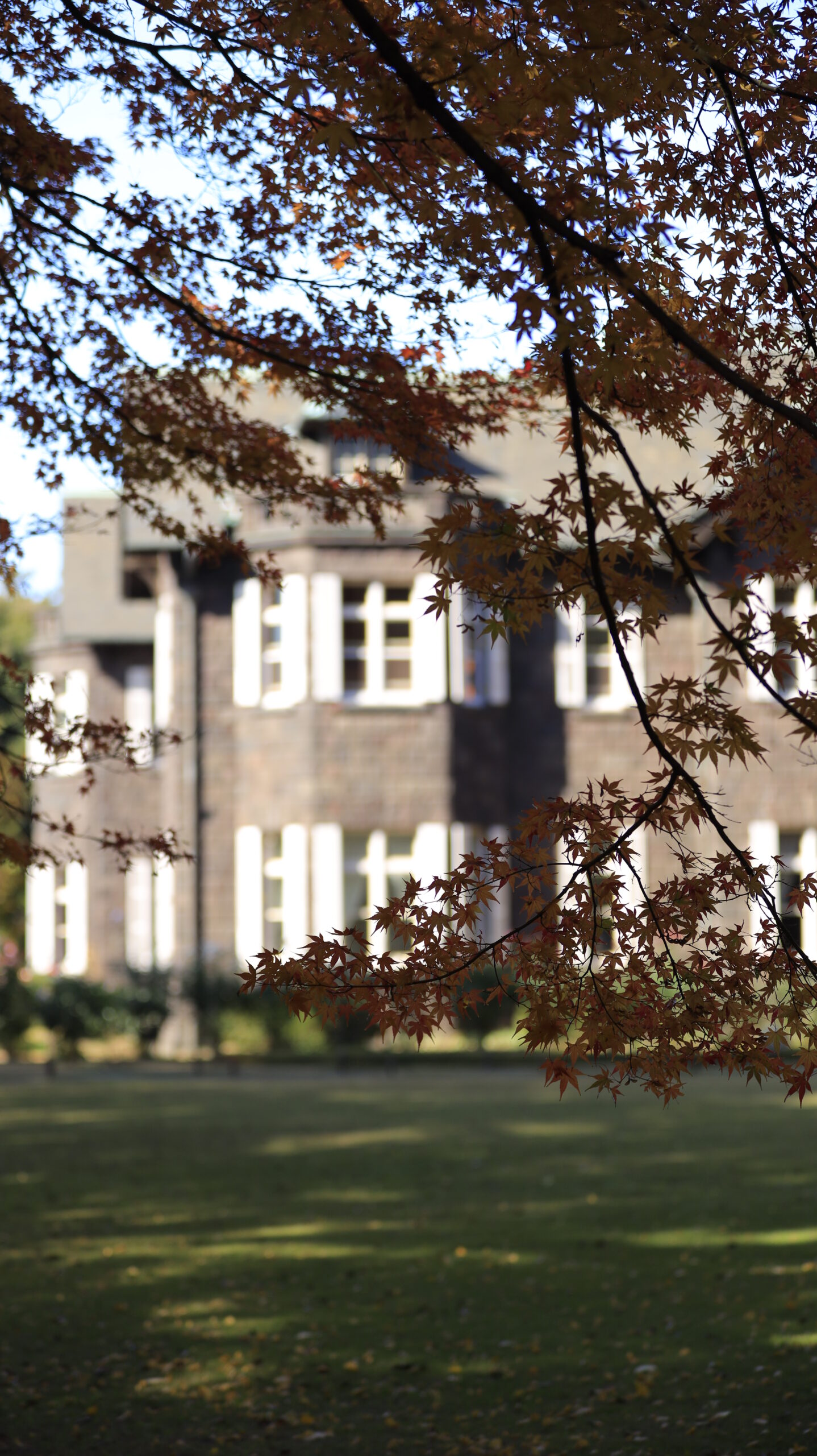 旧古河庭園で、紅葉のモミジの下から背後の洋館をぼかし、和洋が調和する美しい景観。