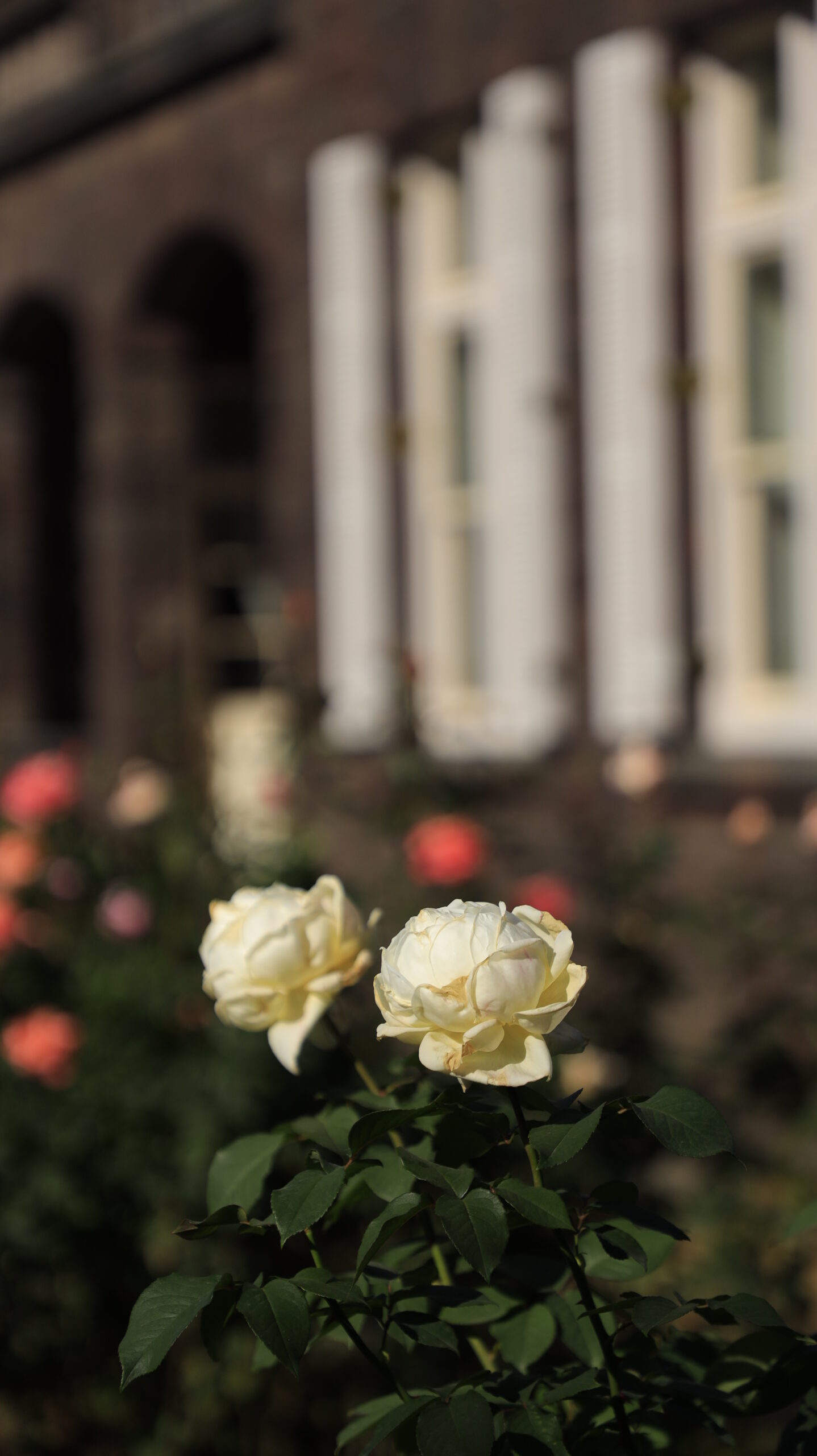 この写真は、旧古河庭園で、白く咲く美しいバラの花を、洋風建築を背景にして撮影したものです。花の純白と建物の落ち着いた色合いが調和し、優雅な庭園の魅力が感じられます。