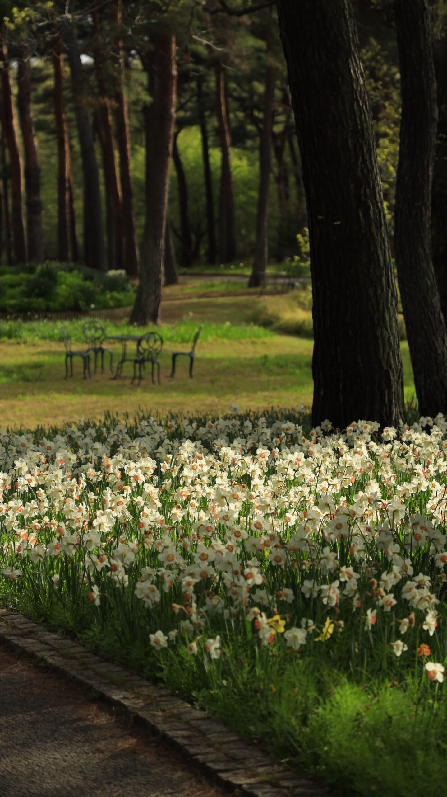 この写真は、国営ひたち海浜公園で、水仙の森の中でわずかに差し込む光が水仙に当たる瞬間を狙って撮影したものです。